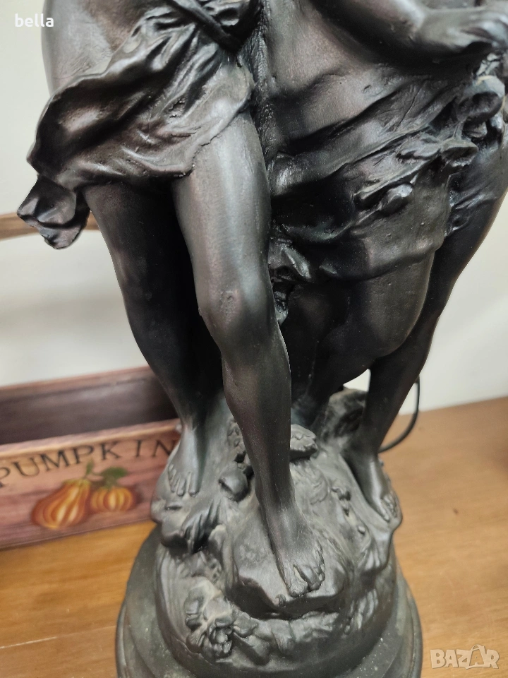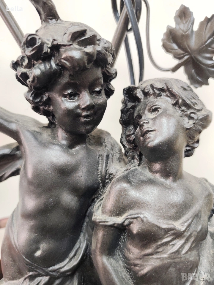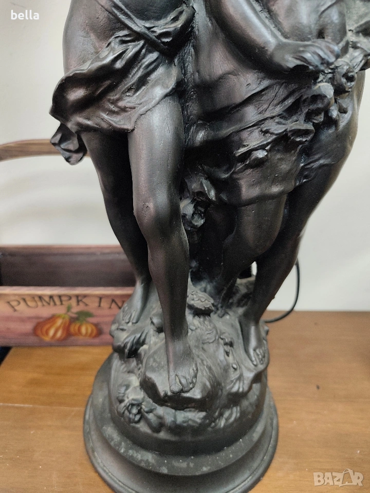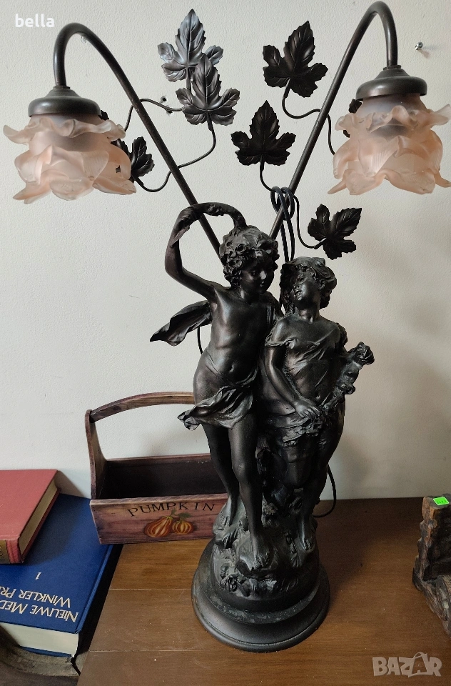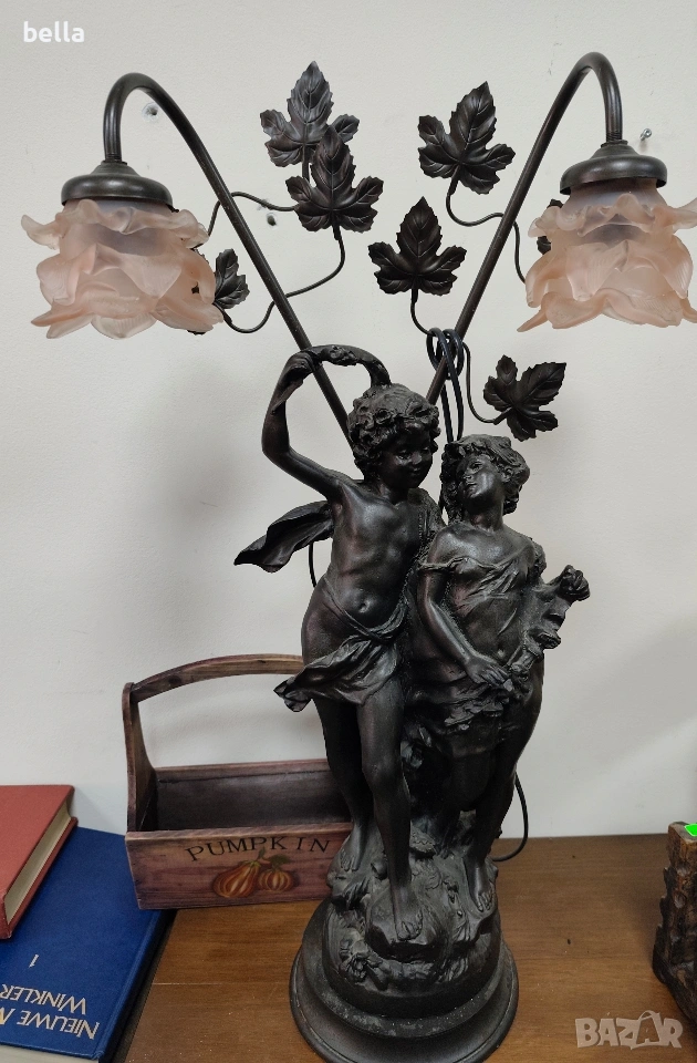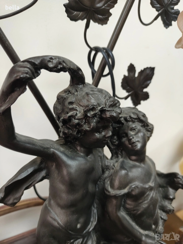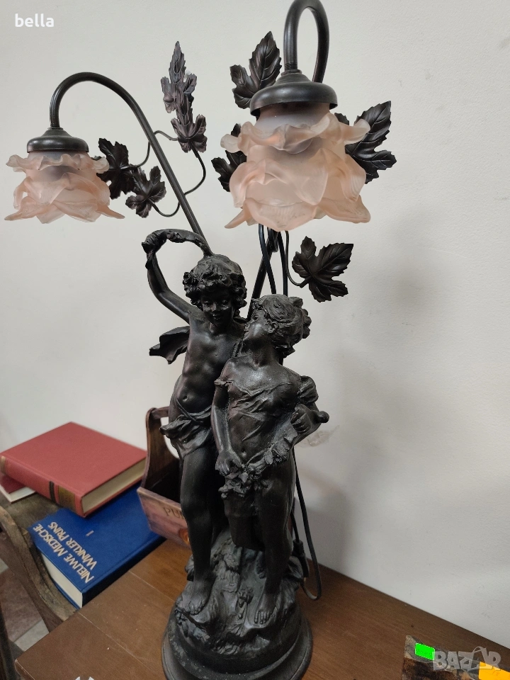 Изящна настолна лампа с впечатляващи размери и класически дизайн, вдъхновен от епохата на сецесиона. Тази лампа не е просто осветително тяло, а истинска скулптурна композиция, която внася аристократизъм и уют във всеки интериор. ​Респектиращите 71 см, което я прави централен акцент в помещението. ​ Изработена от висококачествен, плътен полистрол, който придава на фигурата значителна тежест и стабилност. ​Повърхността е прецизно патинирана в цвят „старинен бронз“, пресъздаващ автентичния облик на класическите метални отливки. ​Два завършващи красиви стъклени абажури във формата на разцъфнали лалета. Матираното стъкло в мек прасковен нюанс осигурява топла и дискретна светлина.Цена 300 евро