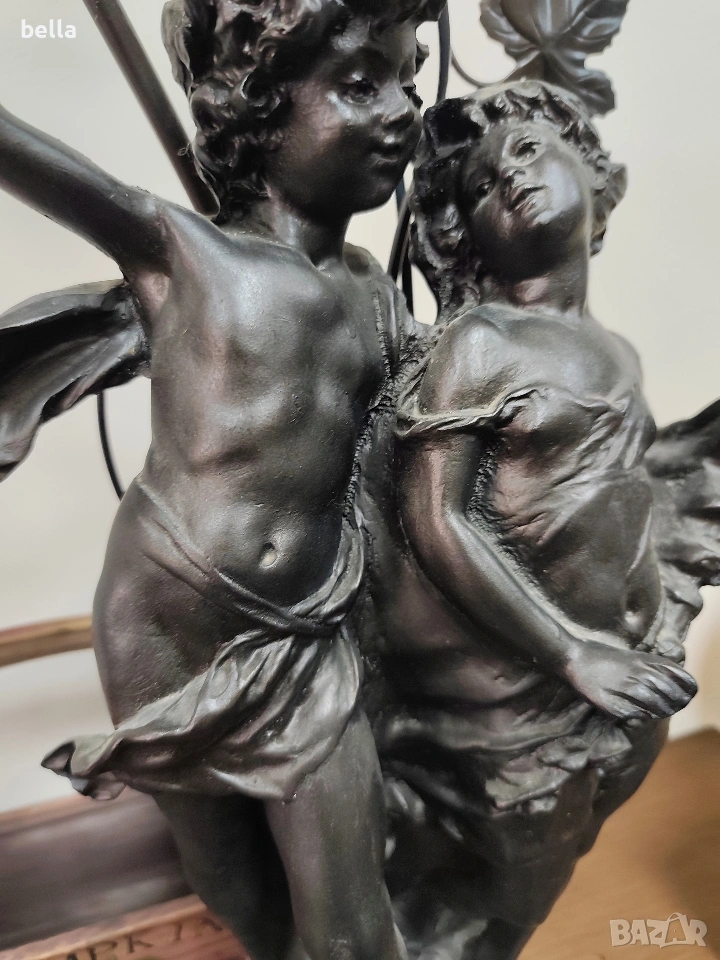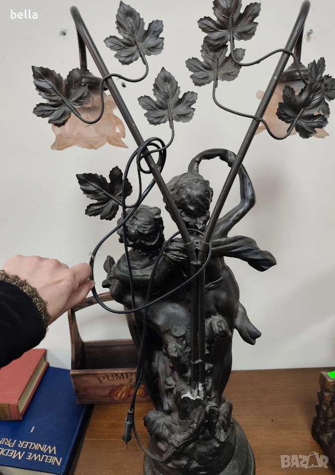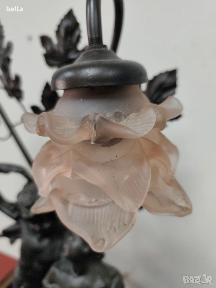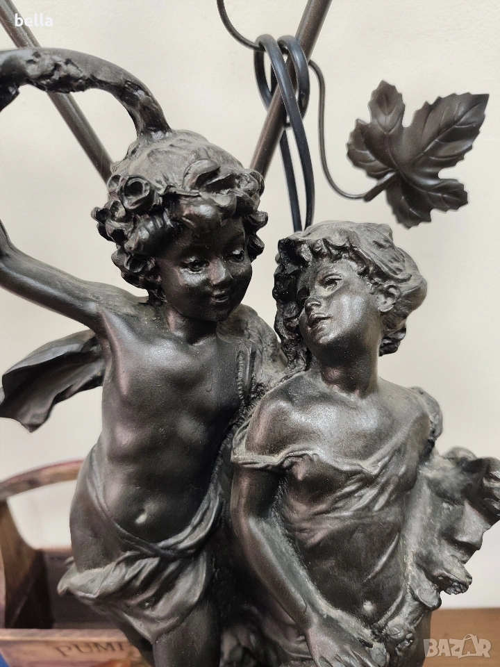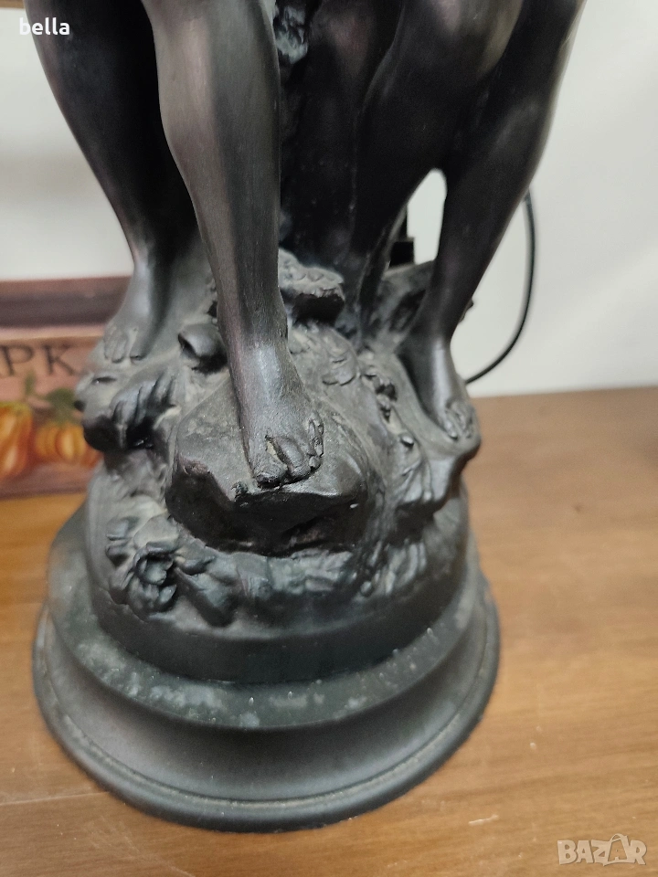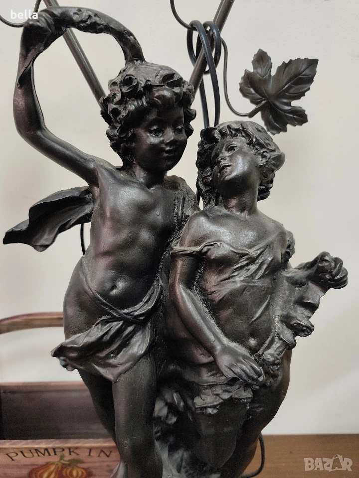 Изящна настолна лампа с впечатляващи размери и класически дизайн, вдъхновен от епохата на сецесиона. Тази лампа не е просто осветително тяло, а истинска скулптурна композиция, която внася аристократизъм и уют във всеки интериор. ​Респектиращите 71 см, което я прави централен акцент в помещението. ​ Изработена от висококачествен, плътен полистрол, който придава на фигурата значителна тежест и стабилност. ​Повърхността е прецизно патинирана в цвят „старинен бронз“, пресъздаващ автентичния облик на класическите метални отливки. ​Два завършващи красиви стъклени абажури във формата на разцъфнали лалета. Матираното стъкло в мек прасковен нюанс осигурява топла и дискретна светлина.Цена 300 евро