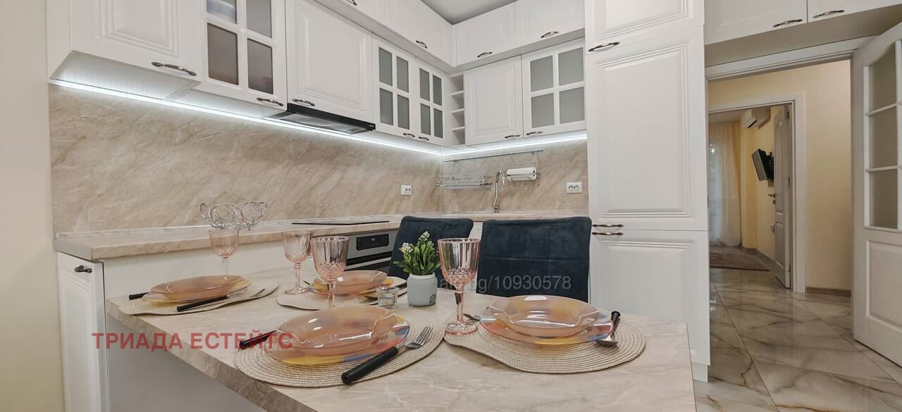 Апартаментът се отдава под наем напълно обзаведен с внимание към детайла и нови мебели. Кухнята е оборудвана с висок клас електроуреди: