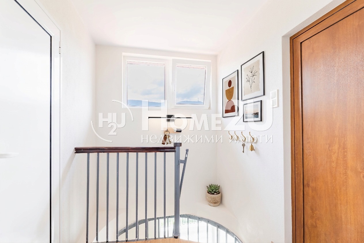 ХоумТуЮ има удоволствието да представи на Вашето внимание четиристаен мезонет, находящ се на една от най-спокойните и предпочитаните локации на южна София, а именно границата на ж.к.Бъкстон и кв.Павлово. Жилището е със следното функционално разпределение - Ниво 1: Просторна дневна с трапезария и излаз на тераса голяма тераса с южно изложение и нескриваема гледка към Витоша, обособена кухненска ниша, баня с тоалетна и спалня. Ниво 2: Две спални и баня с тоалетна. Апартаментът е след основен ремонт - завършен до ключ с оборудвана кухня, изцяло сменена дограма, както и ремонтирани бани. Отоплението е на ток, като има камина в дневната, което позволява още една възможност за отопление през зимата. Имота се намира в малък комплекс от две пететажни жилищни сгради, които са въведени в експлоатация през 1997г. Сградата е добре поддържана и с добре поддържан общ двор, където има изградена беседка за общо ползване на живущите в сградата.Към имота има голям, наземен, гараж със секционна ел.врата, като има прокарани ток и вода в гаража, а има възможност и за паркиране свободно на втора кола пред гаража в двора. Гаража е на отделна цена - 50 000 евро. Сградата се намира на 50м от 5-то ОУ 'Иван Вазов',детски градини, спирки на градски транспорт - трамвай 5, автобуси 107 и 63, тролей 2 с бърза връзка към главните пътни артерии на София и Център, както и големи вериги магазини 'Кауфланд' и 'Лидл'. Снимките са илюстративни с цел придобиване на по-добра представа, състоянието на имота е завършен ДО КЛЮЧ. За Ваше улеснение прилагаме схема с разпределение на имота! Ако този прекрасен имот представлява интерес за Вас, обадете се сега и цитирайте този код:132312