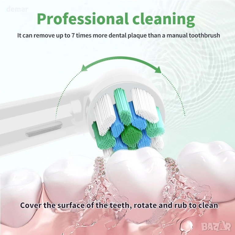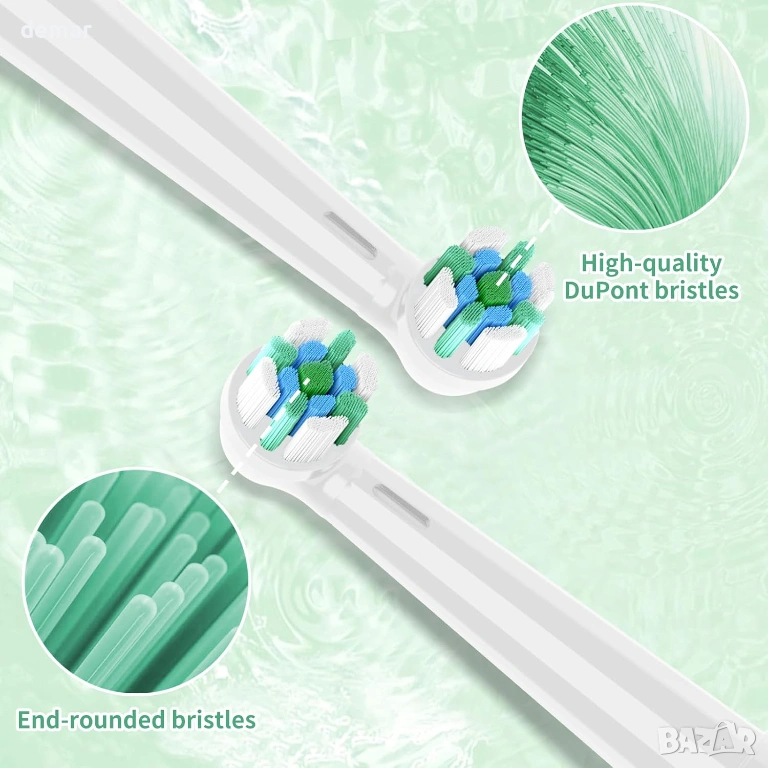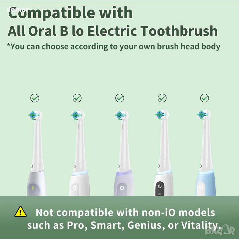 Съвместима с електрическите четки за зъби Oral-B iO Series (iO 2–10), но не е подходяща за модели, които не са с iO, като Pro, Smart, Genius или Vitality. Всяка сменяема глава е проектирана за около три месеца употреба, а комплектът включва шест глави, осигуряващи до 18 месеца миене на зъби. Минималистичният дизайн премахва видимото лого, като същевременно запазва същото качество на изработка. Подобрените влакна DuPont предлагат цялостно почистване между зъбите и спомагат за намаляване на петната от кафе и цигари, като същевременно остават достатъчно меки, за да предпазват венците. Зелените индикаторни влакна постепенно избледняват, за да сигнализират кога е необходима смяна. Изработена от хранителни материали, които отговарят на международните екологични стандарти, всяка глава на четката включва и индивидуална санитарна защитна капачка за хигиенично съхранение у дома или по време на пътуване.