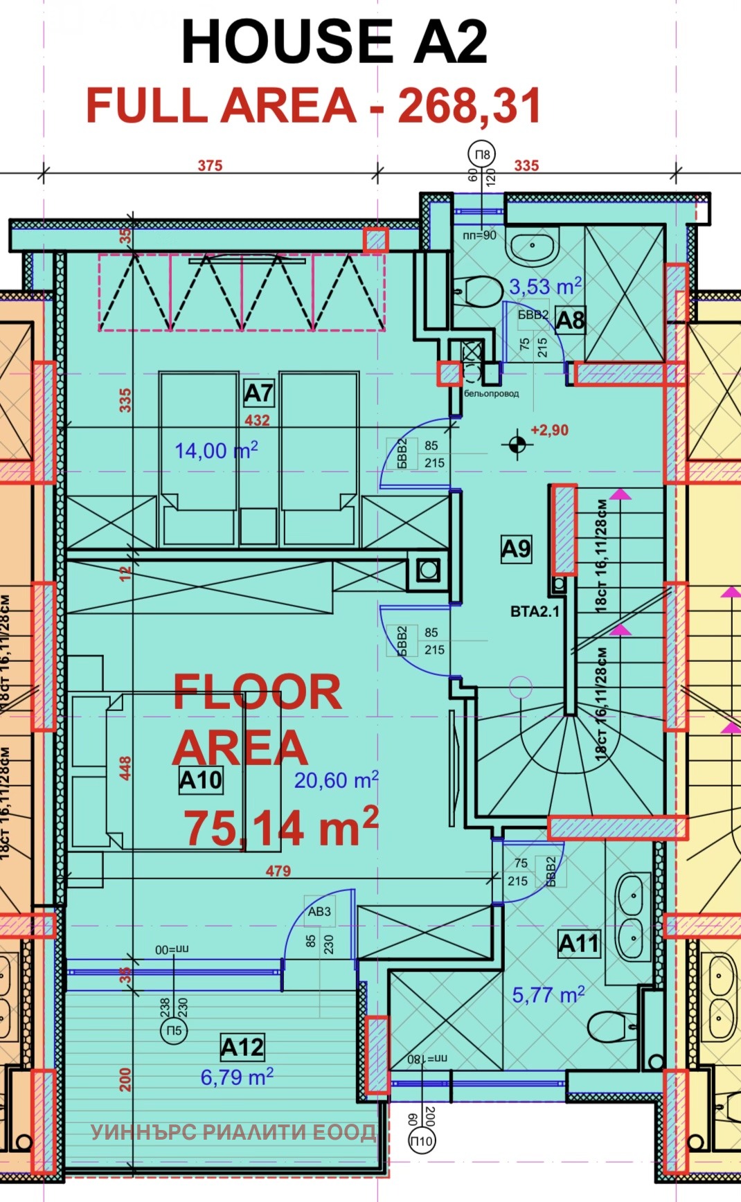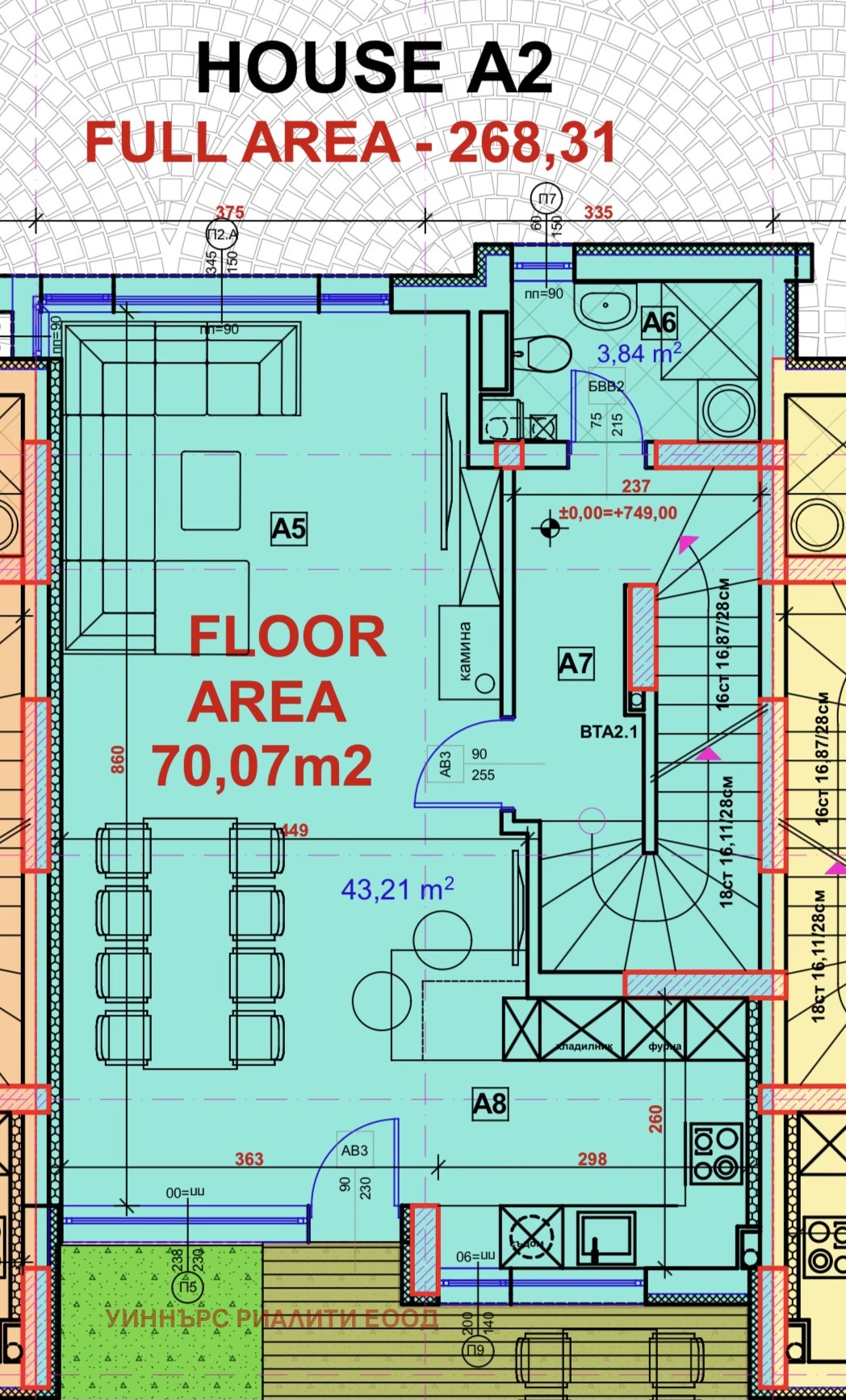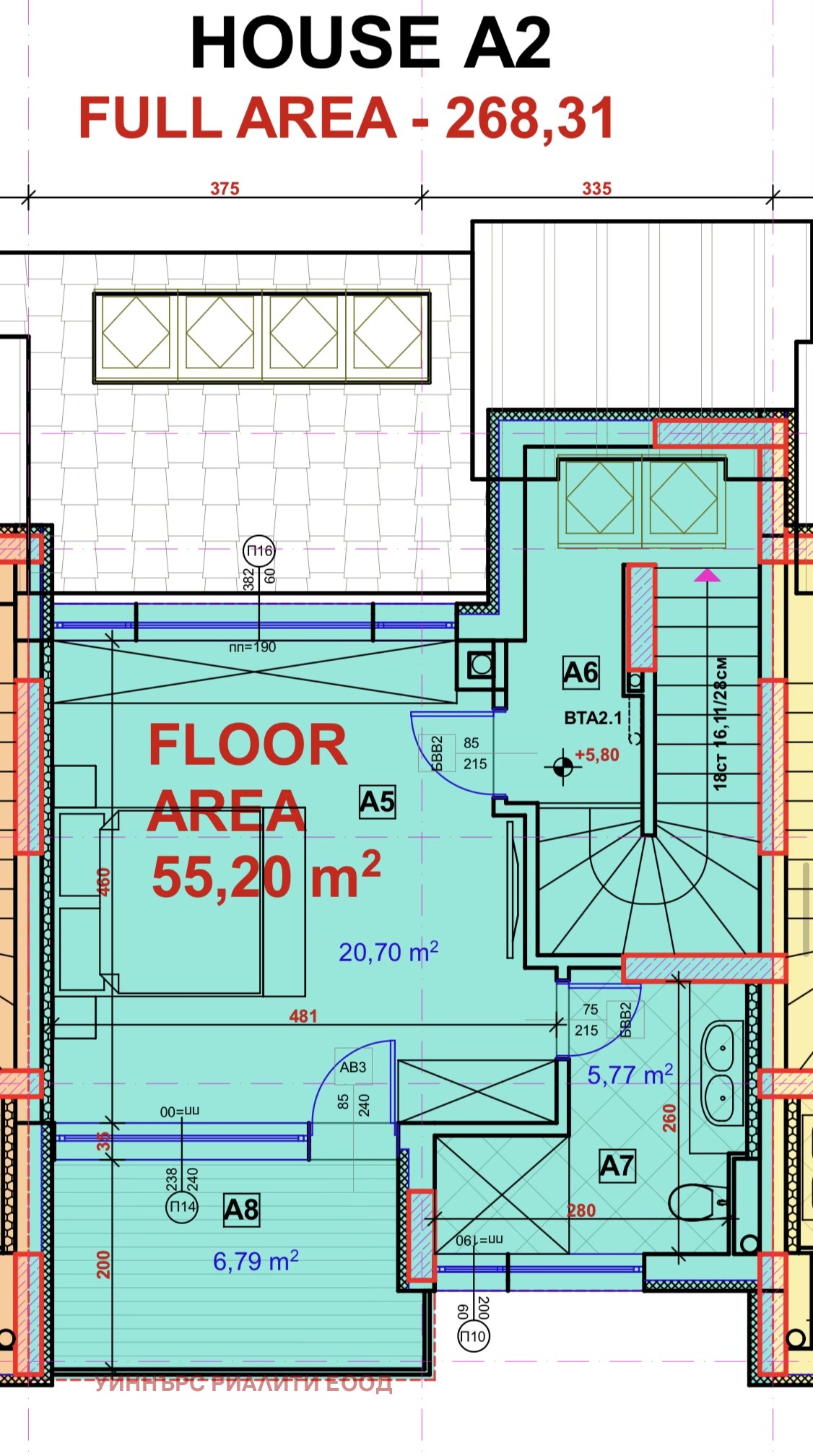 Строителството е извършено с тухли Wienerberger Prototerm. 7-камерна дограма REHAU и скатни прозорци троен стъклопакет Velux, най-висок клас. Плосък покрив с италианска хидроизолация на General Membrane APP - 10. Отоплението е изцяло решено с термопомпи и конвектори и изградено подово отопление във всички помещения.Самостоятелните дворове разполагат с поливна система, предварително озеленяване и тревни площи.Пречиствателно съоръжение на фирма Pi Trade One2Clean 14. Дължи се ДДС.