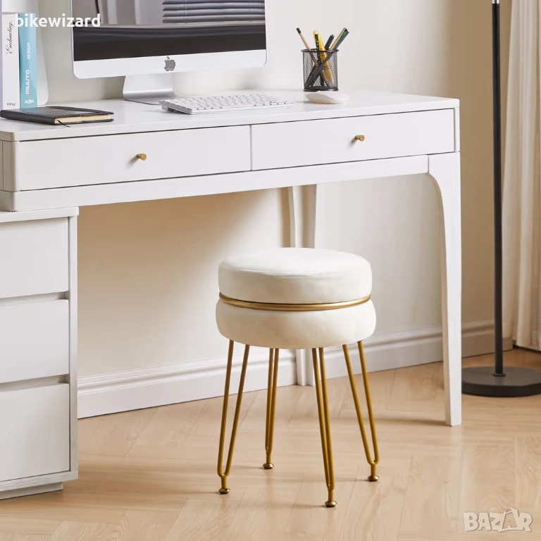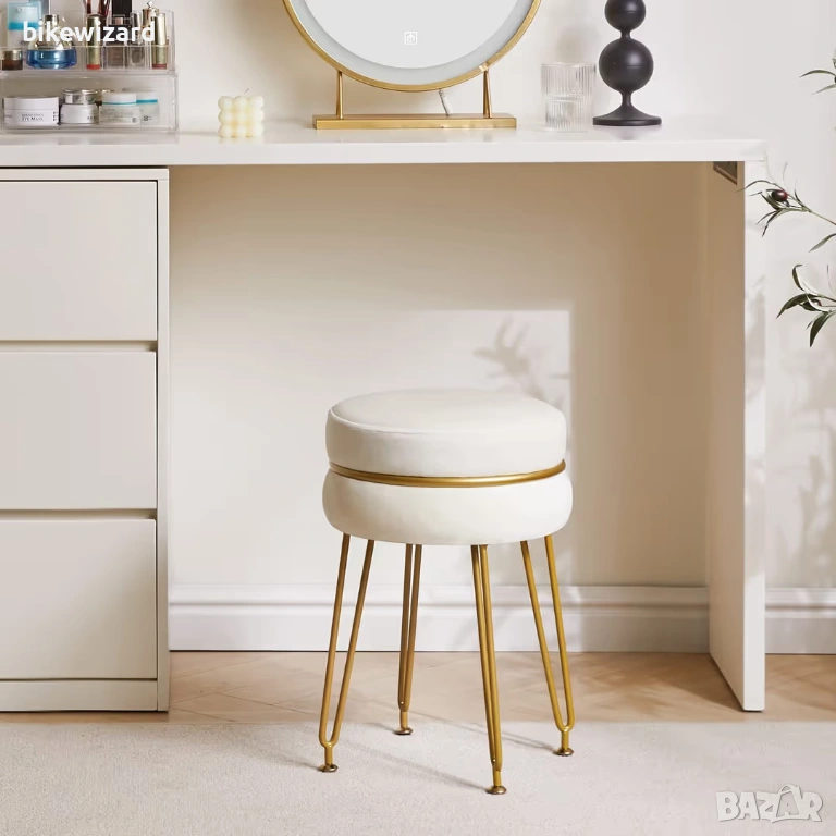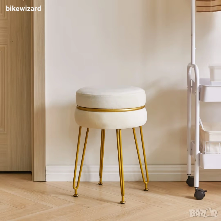 Модерна кадифена кръгла табуретка със златисти крака – кремаво-бяла НОВА