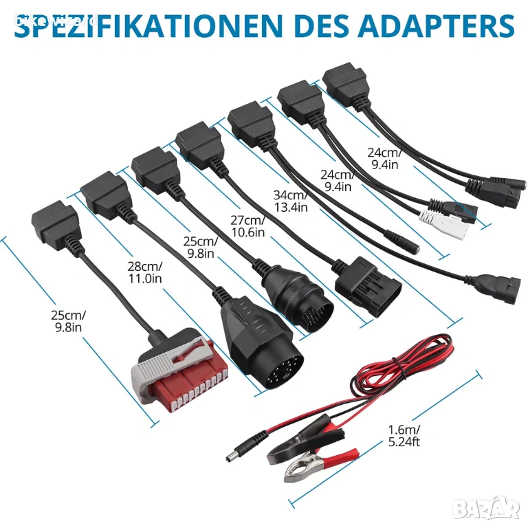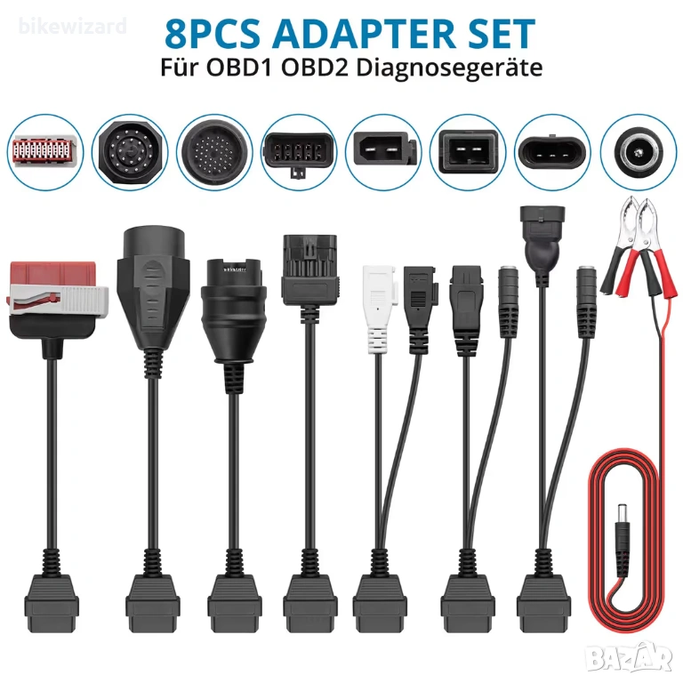 Комплект от 8 адаптерни кабела за диагностика: 8 броя адаптерни кабела за автомобилна диагностика, използвани за диагностичния интерфейсен инструмент OBD2 на автомобила. С този адаптерен комплект можете да свържете OBD диагностичното устройство към вашия автомобил, както и към автомобил без OBD2 интерфейс.