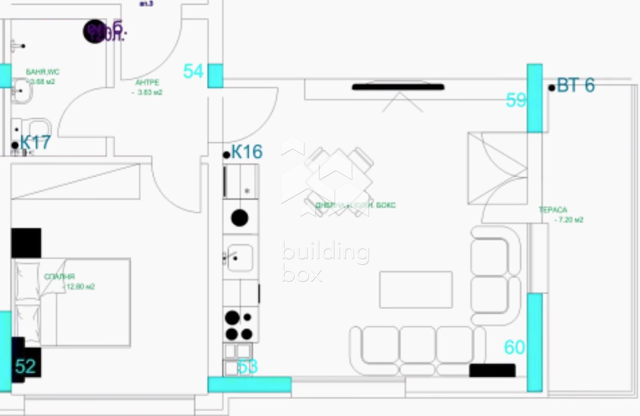 - РАЗПРЕДЕЛЕНИЕ: Всекидневна с кухненски бокс, спалня, антре, баня с тоалетна и тераса*.