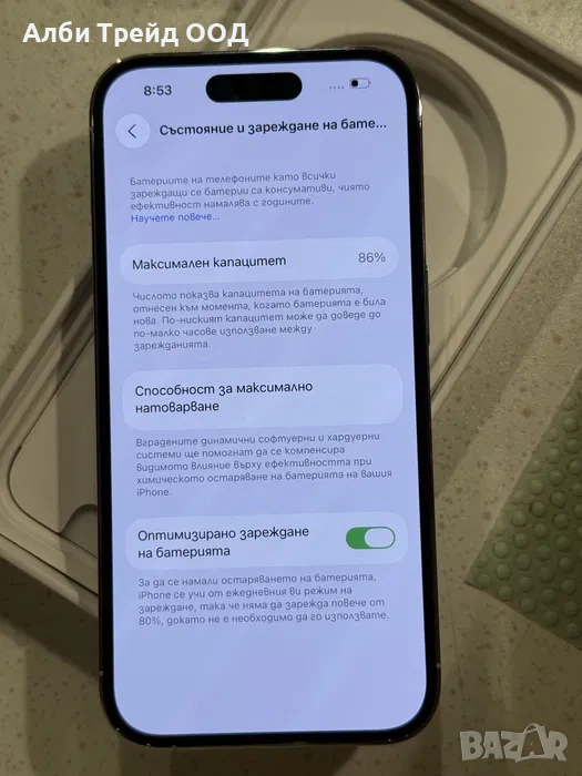 Батерията е оригиналната му, с капацитет 86% в идеално здраве и с издръжливост на високо ниво.