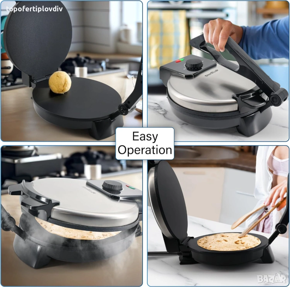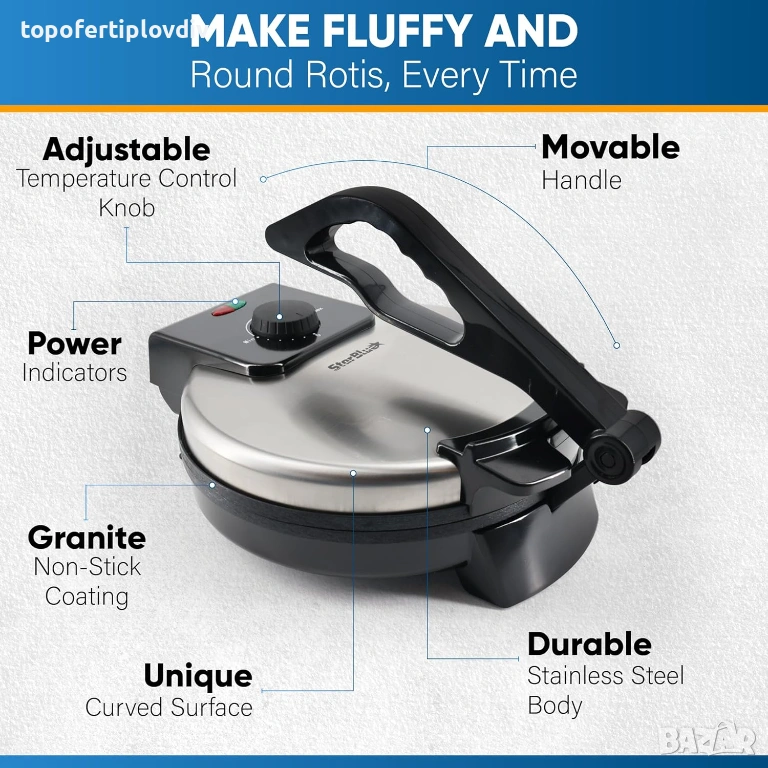 ПРЕМАХВАЩА СЕ ДРЪЖКА - Уредът/пресата за тортили, палачинки, пърленки има подвижна дръжка, която я прави лесна за носене и съхранение. Дръжката осигурява и удобен захват при приготвяне на чапати.