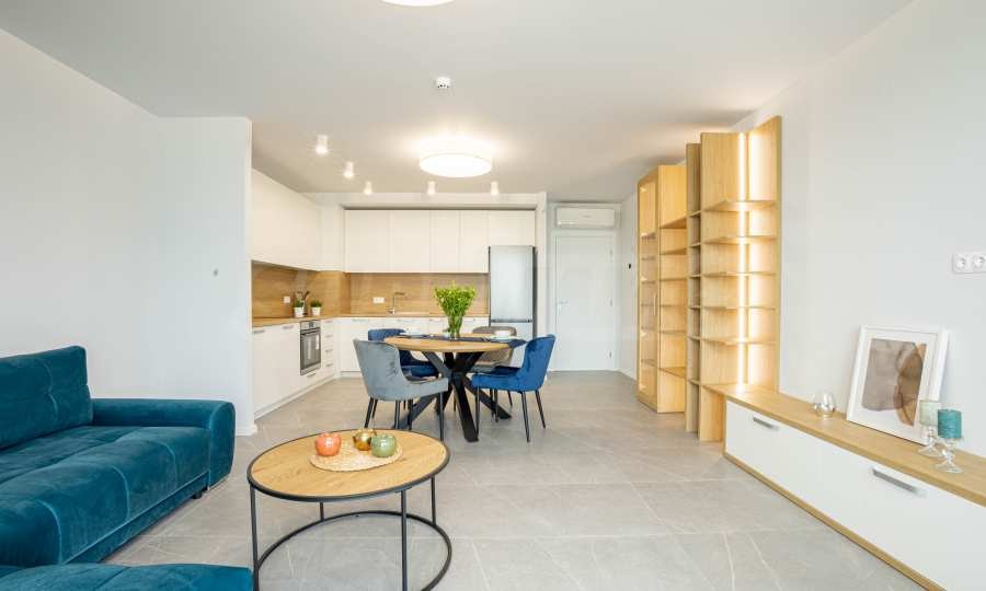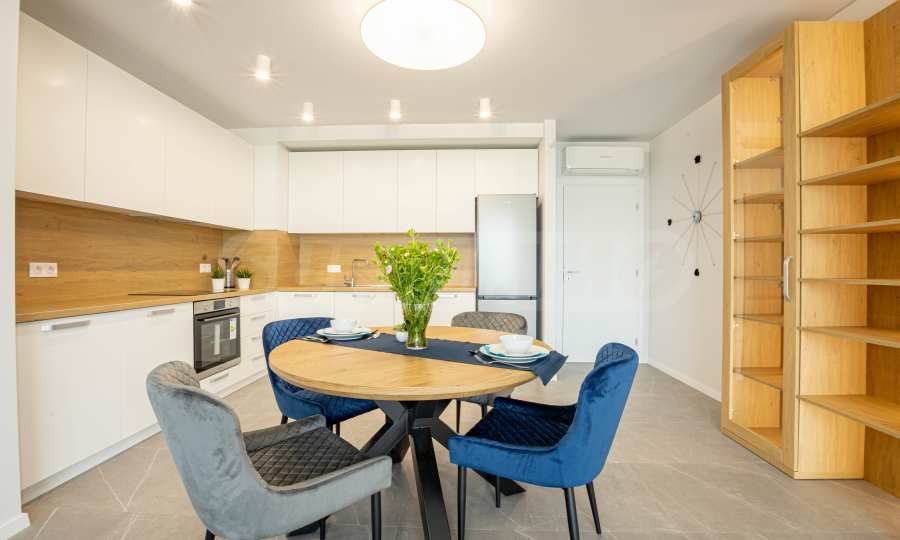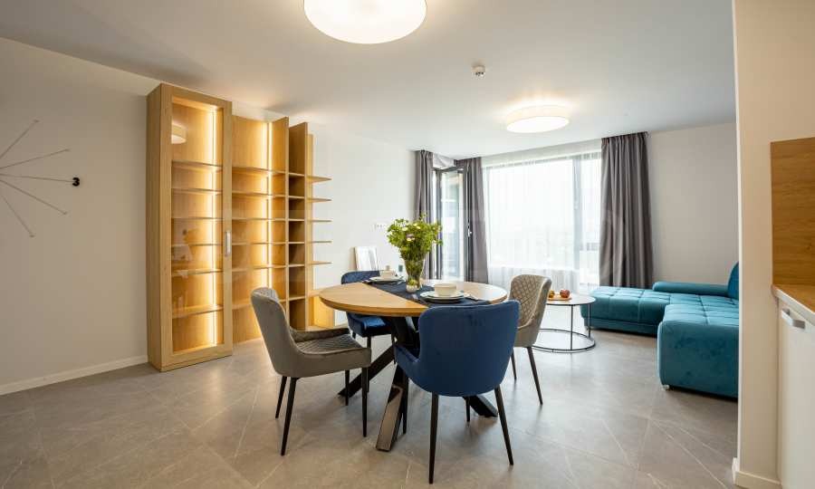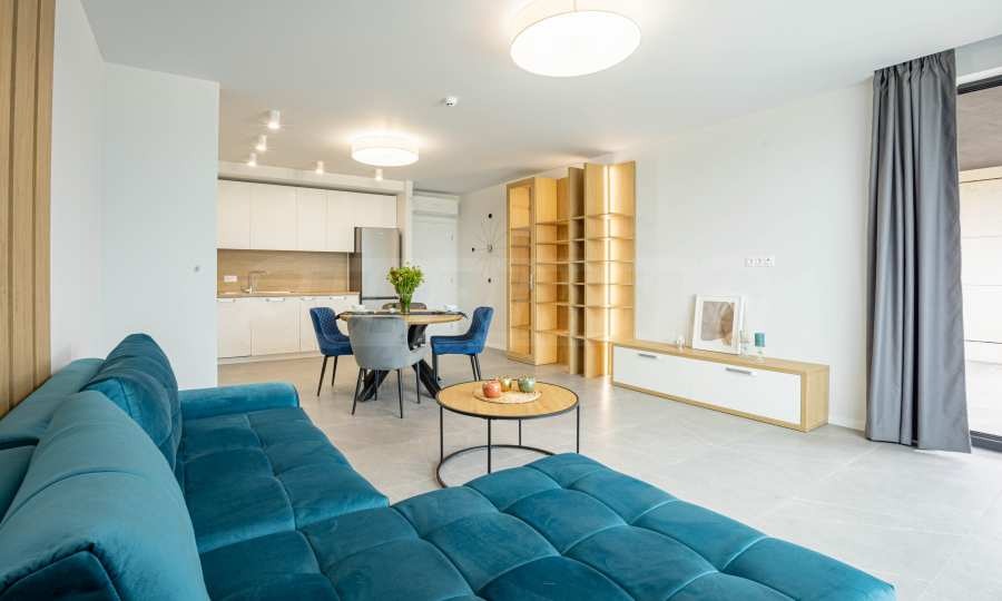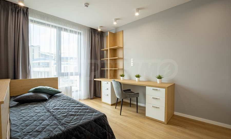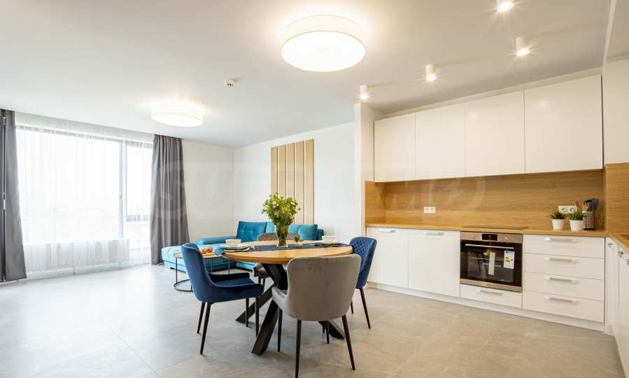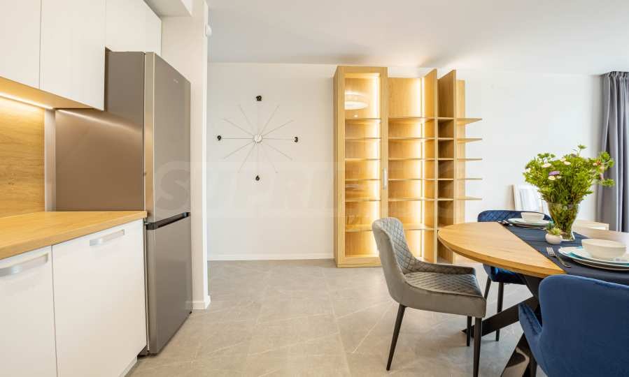Апартаментът е ситуиран на 2-ри етаж и предлага 148.22 кв.м обща площ. Интериорът му е модерен, завършен с качествени довършителни работи и висок клас мебели по проект.