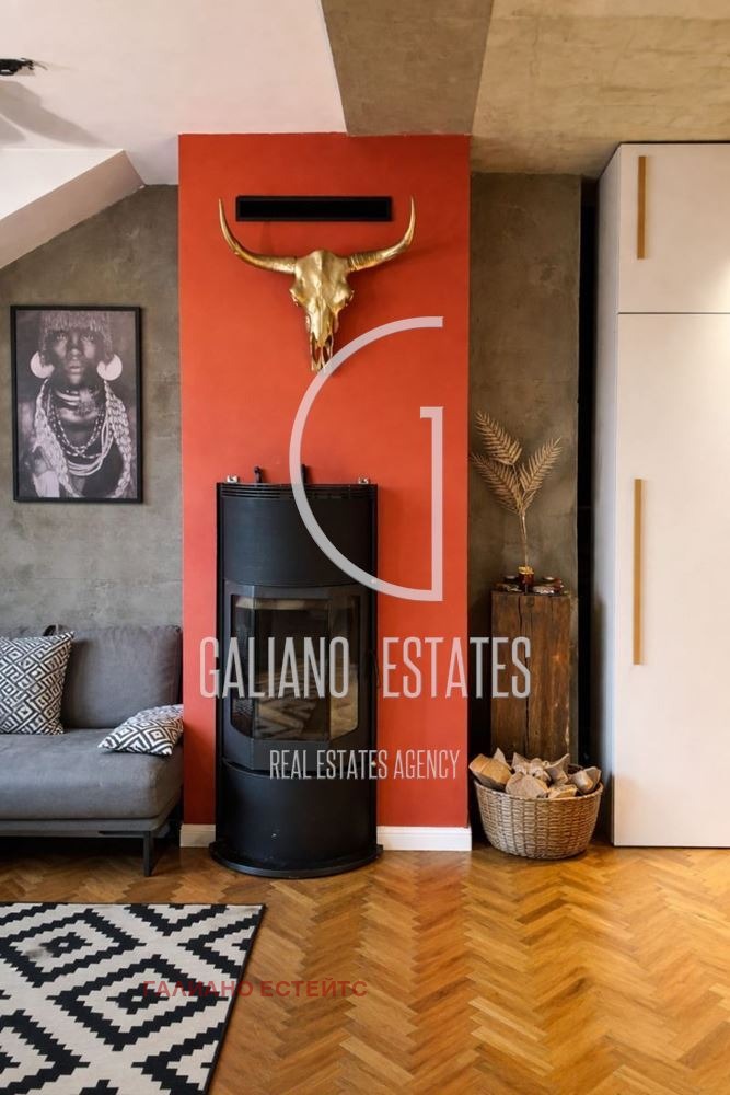 Имотът е решен в индустриално-модерен стил с бетонни акценти, висок клас материали и дизайнерски детайли. Просторната дневна зона (~45 кв.м.) тип open space обединява хол, трапезария и кухня, а характерната камина придава уют и индивидуалност на пространството.