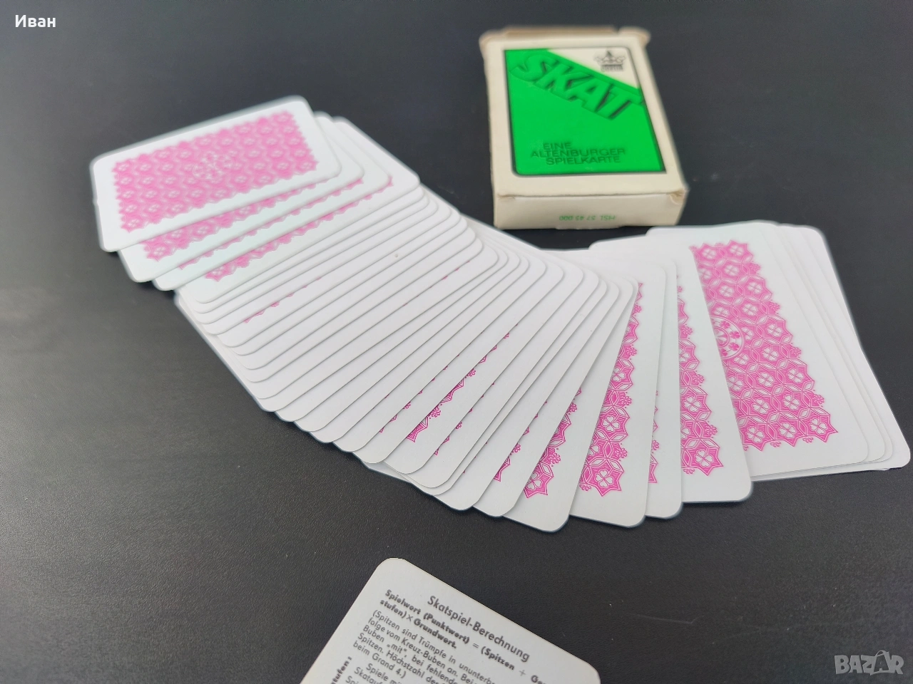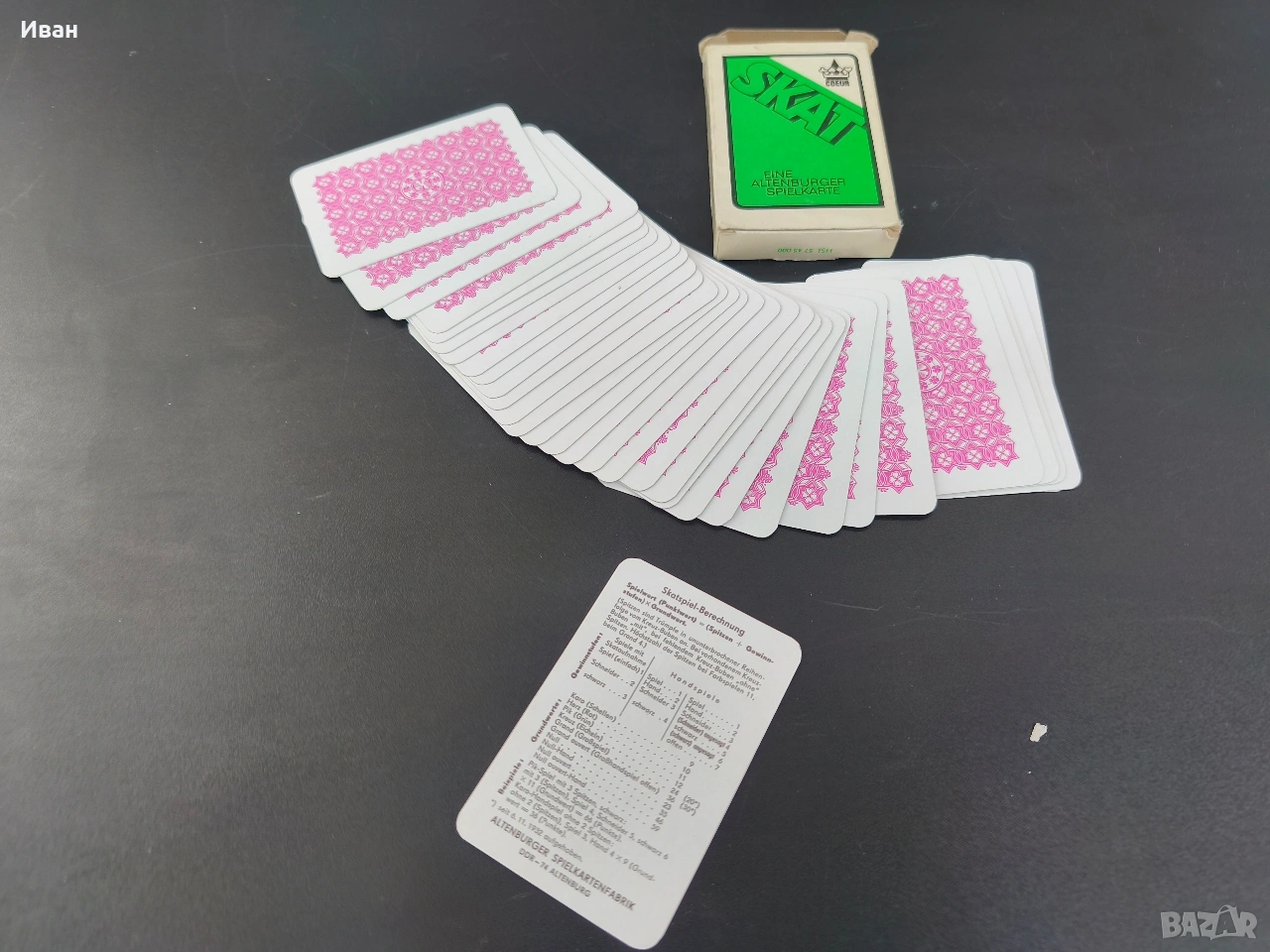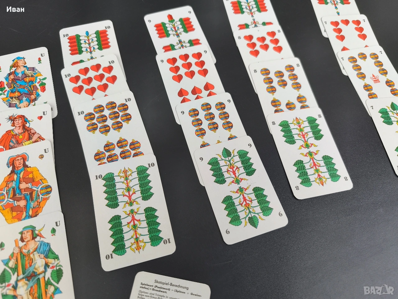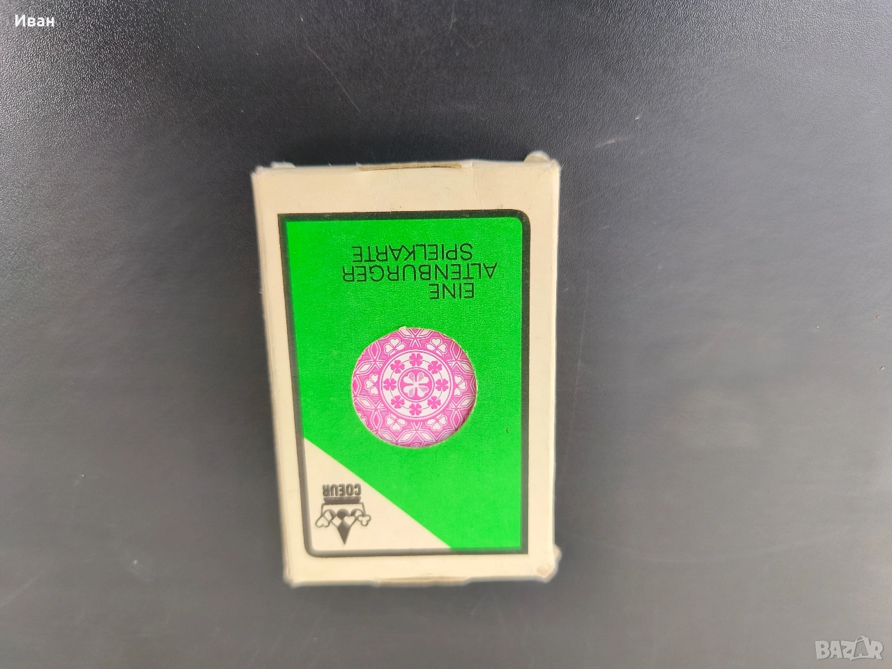 Цена -15 евро Много добро състояние без мръсотия и пожълтяване , леки забележки само на кутията 32 карти . немски карти за игра, произведени от Altenburger Spielkarten под марката Coeur. Произведени в бившата Източна Германия (ГДР). предназначени за игри като Skat (тесте от 32 карти) или Doppelkopf.