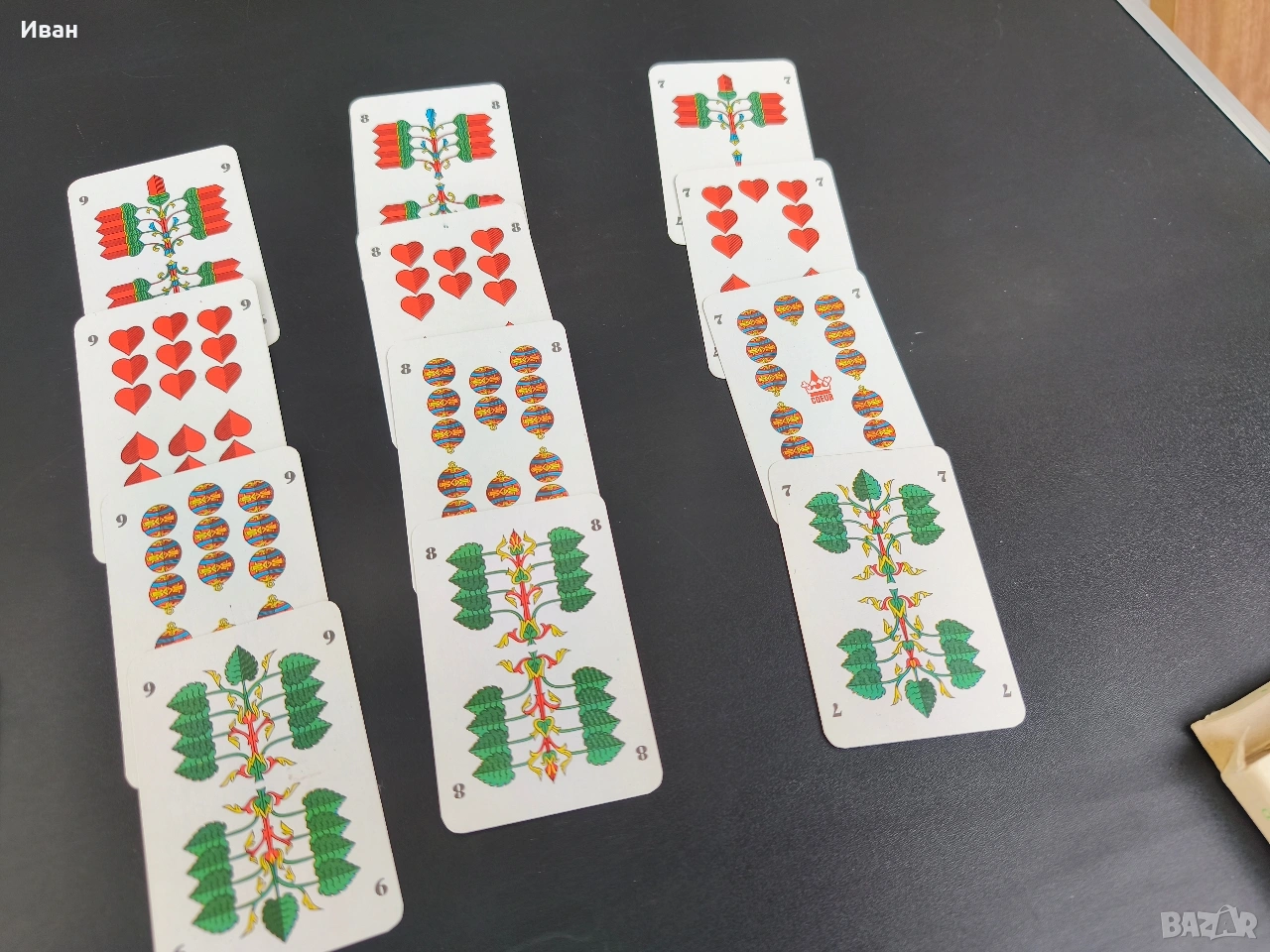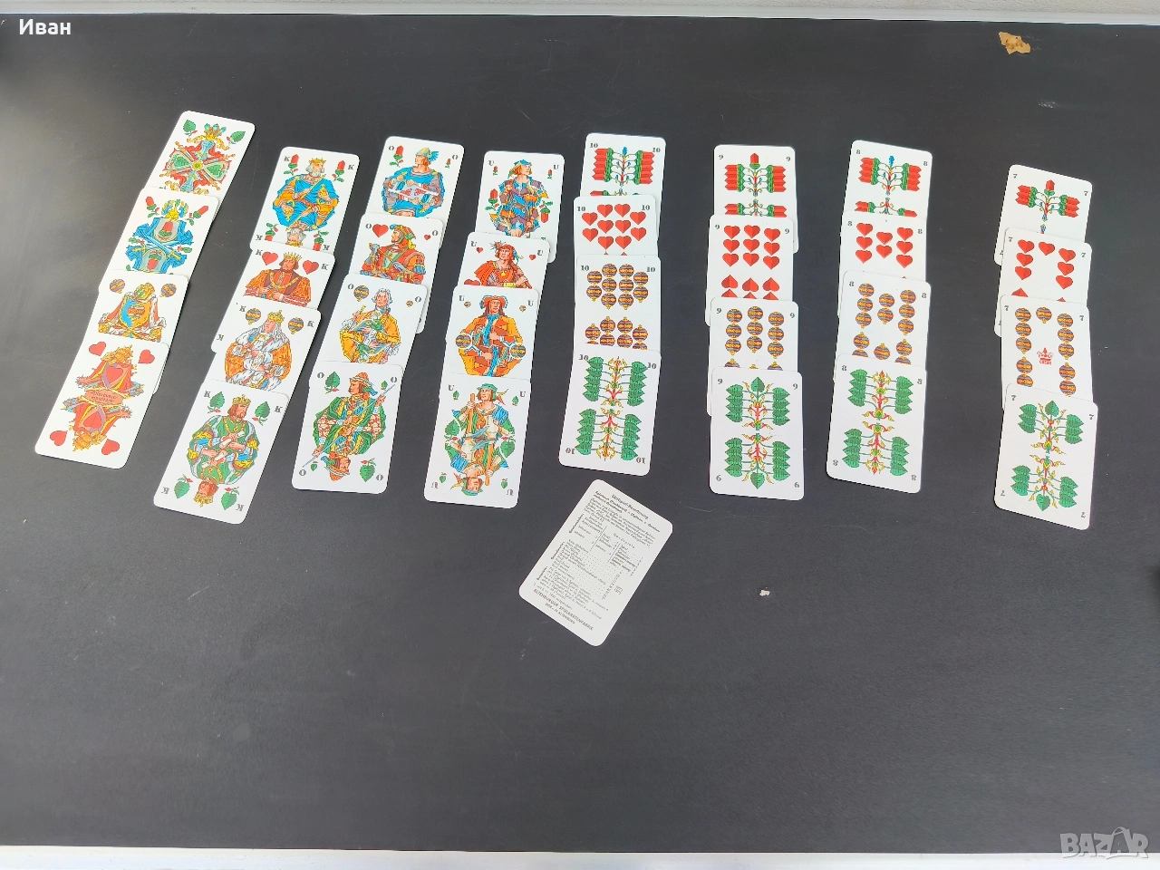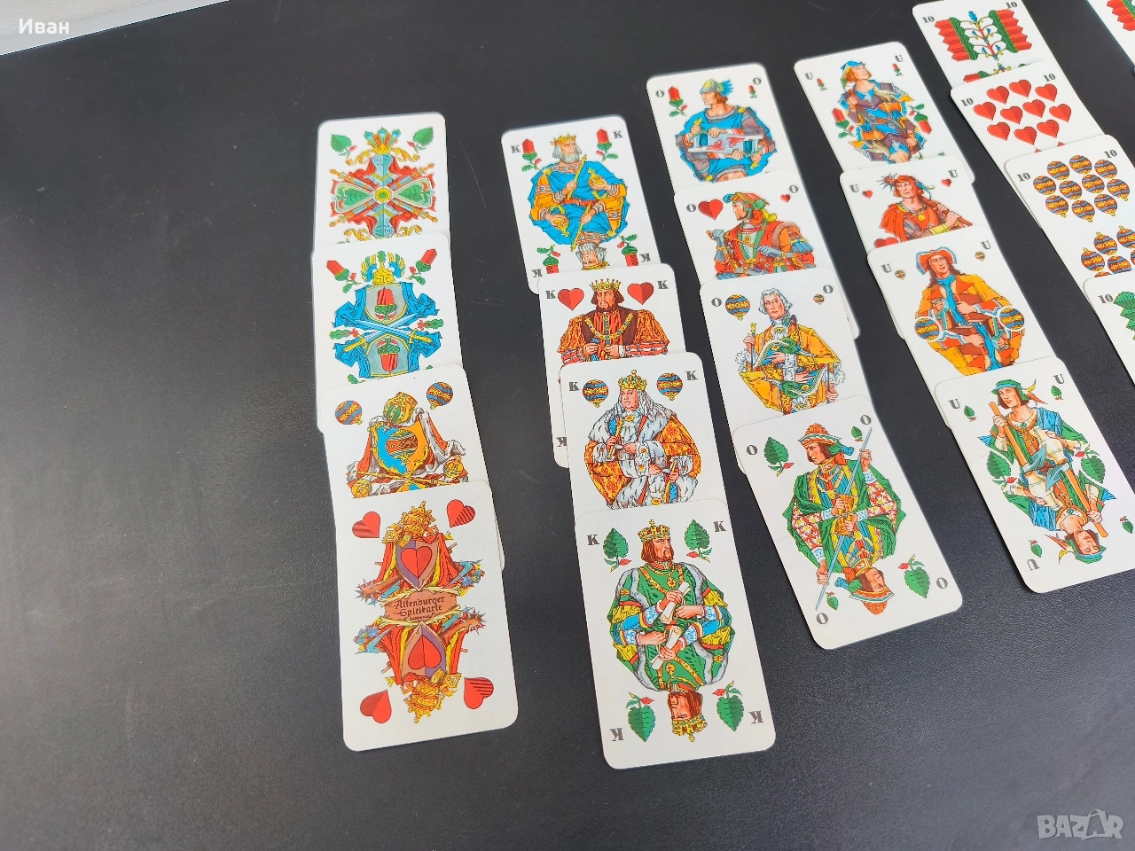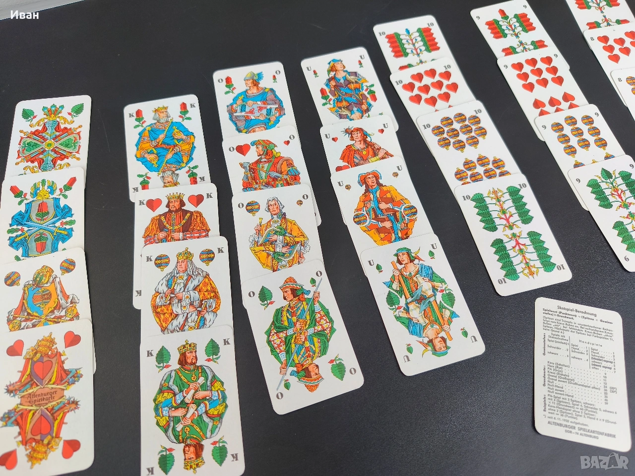 Цена -15 евро Много добро състояние без мръсотия и пожълтяване , леки забележки само на кутията 32 карти . немски карти за игра, произведени от Altenburger Spielkarten под марката Coeur. Произведени в бившата Източна Германия (ГДР). предназначени за игри като Skat (тесте от 32 карти) или Doppelkopf.
