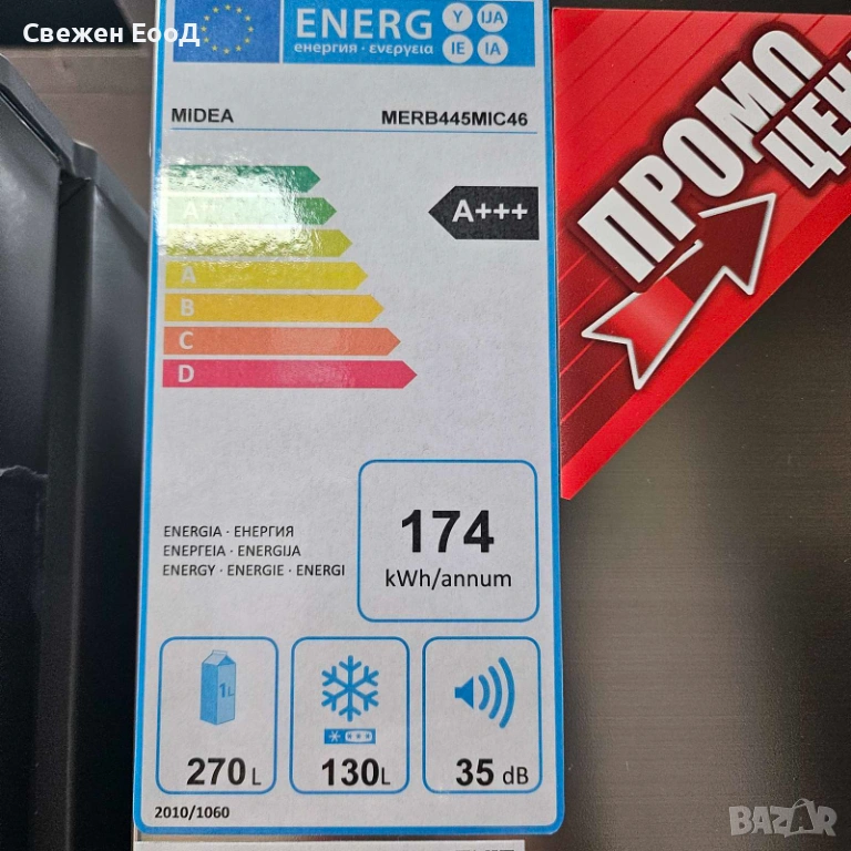 Хладилникът с фризер Midea "MERB445MIC46" предлага висока функционалност и енергийна ефективност от C (по скала от A до G). С капацитет на фризера от 130 литра и капацитет на хладилника от 312 литра, моделът е с размери 59,5 x 201 x 68,8 см (Ш/В/Д). Работи с ниво на шум от 35 dB. Три чекмеджета на фризера и две чекмеджета за свежи плодове и зеленчуци осигуряват достатъчно място за съхранение. Вътрешният сензорен дисплей показва точната температура и позволява удобна работа. Четири рафта с регулируема височина предлагат много място за храна. Четири рафта на вратата осигуряват допълнителна гъвкавост при съхранение. Функциите SuperFreezing и SuperCooling позволяват особено бързо охлаждане и замразяване на храната. Звукова аларма се включва, ако вратата е оставена отворена твърде дълго. LED вътрешното осветление осигурява лесна видимост на съдържанието. »MERB445MIC46« от Midea е комбинация от хладилник и фризер, която впечатлява със своите характеристики и предлага достатъчно място за всякакви храни.