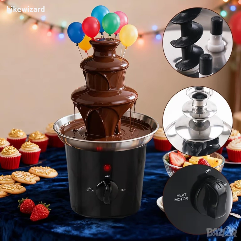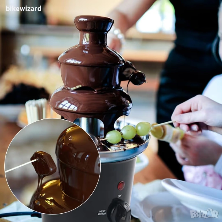 3-степенният шоколадов фонтан има капацитет от 350 г (500 мл), което го прави любимо място за партита; Насладете се с ягоди, резени ябълка, череши, маршмелоу, пуканки, гевреци, крилца, зеленчуци и други.