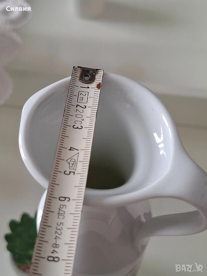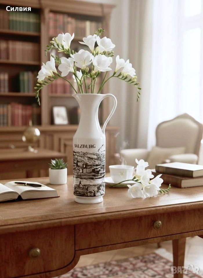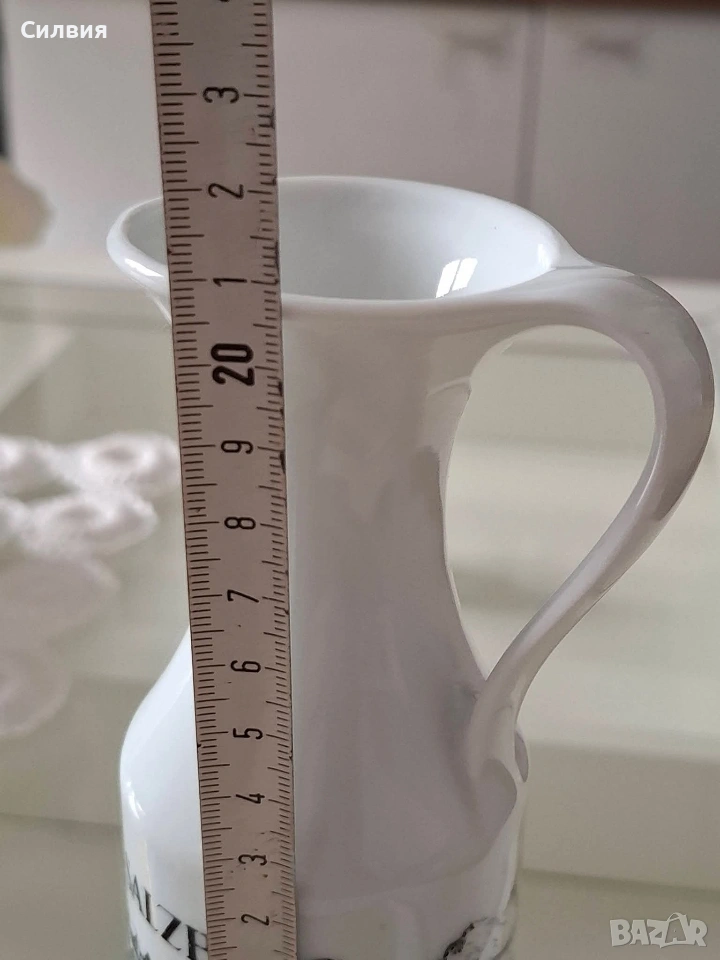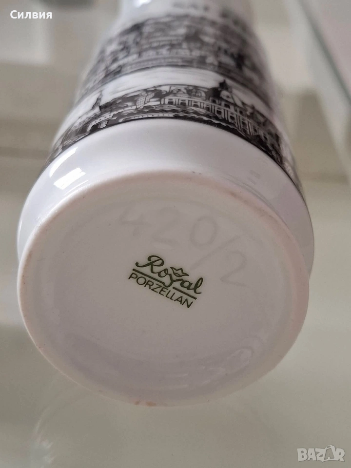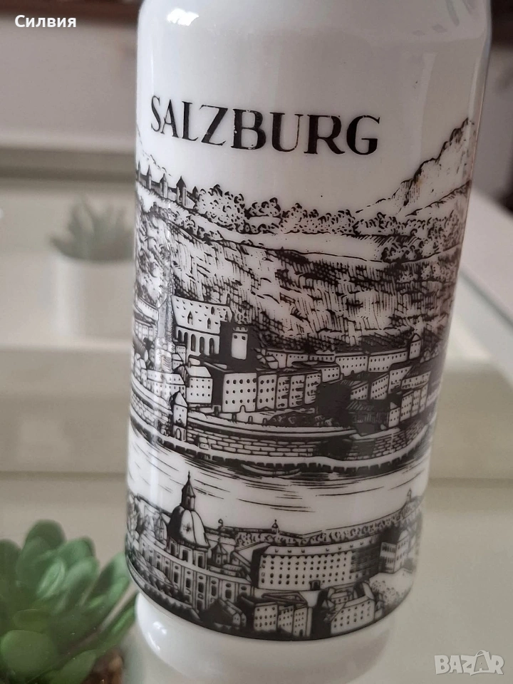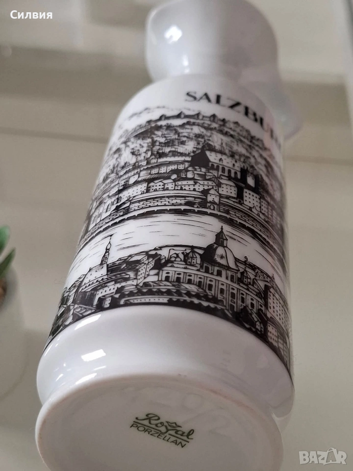 Ретро порцеланова кана/ваза Royal KPM Bavaria – „Salzburg“, 70-те години Порцеланова кана (подходяща и за ваза) на престижната немска марка Royal KPM Bavaria. Предметът е автентичен представител на стилистиката от 70-те години на миналия век. Декорирана с детайлни графични панорами от историческия град Залцбург (Salzburg).Белият висококачествен порцелан и черните графики създават вечен контраст, който придава аристократичен дух на всяко помещение.Произведена през 70-те години, тя съчетава немската прецизност с романтиката на австрийските пейзажи. Височина: 21 см. Налично дъно с печат на производителя. Състояние: отлично винтидж състояние. Стилно допълнение към интериор в класически или антикварен стил, както и за ценители на качествения баварски порцелан. Цена 2️⃣0️⃣€ 《39,12лв 》 •✽✧✽•°”˜🦋”°•✽✧✽•°”˜🦋”°•✽✧✽•°”˜🦋”°•✽✧✽•°”🦋˜”°•✽✧✽•