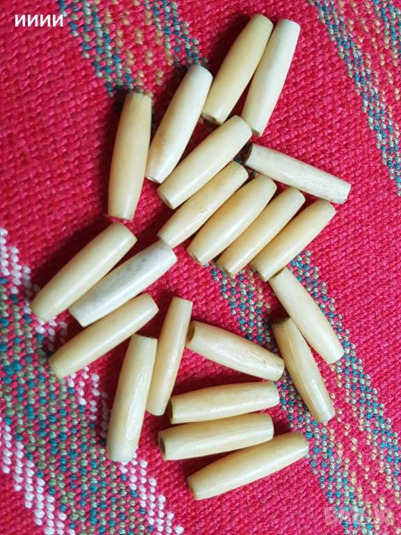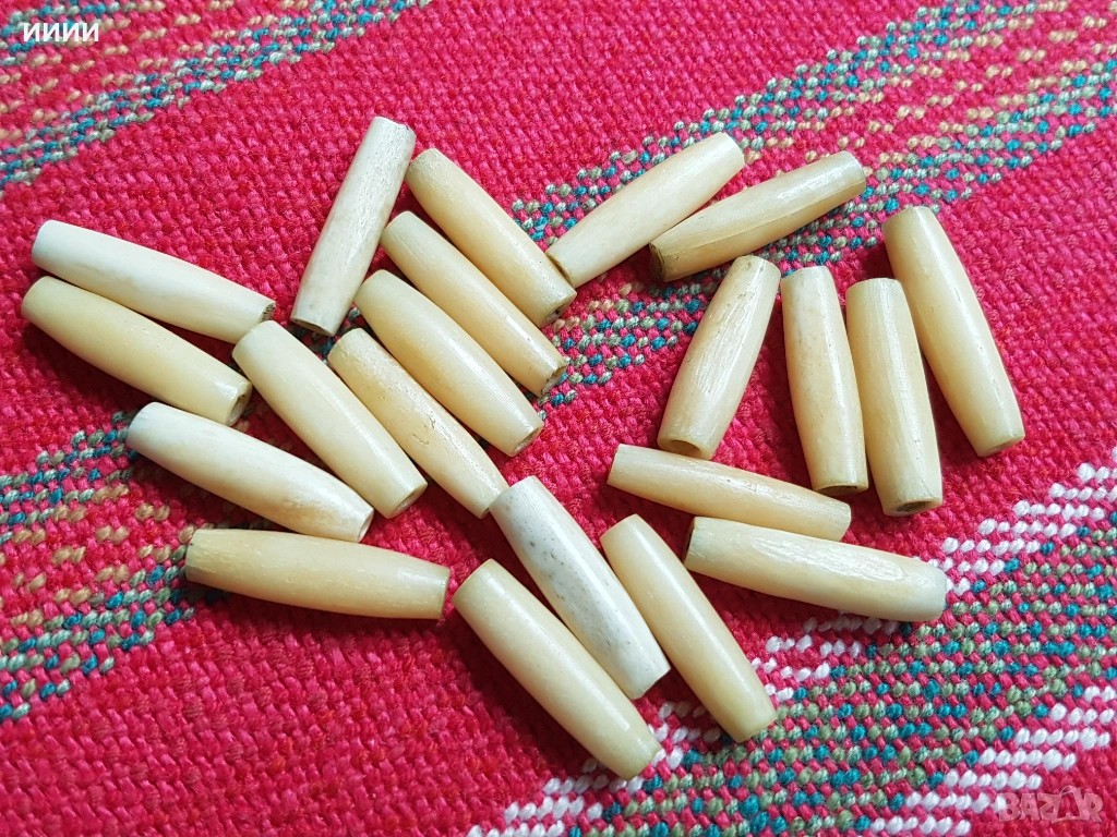 Автентични, ръчно изработени от кокал, запазени и здрави. Дължина по 25 мм, диаметър 7 мм, тежат по около 1,4 гр. Цената е за всичките.