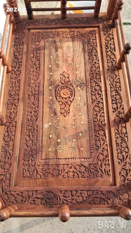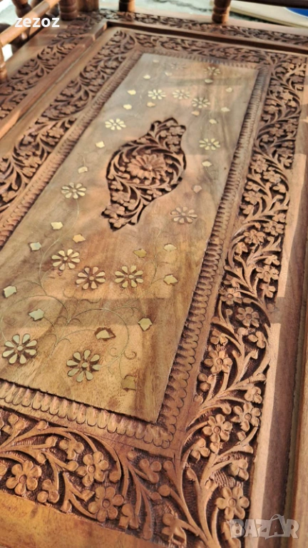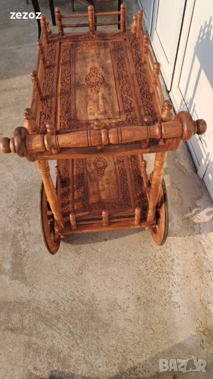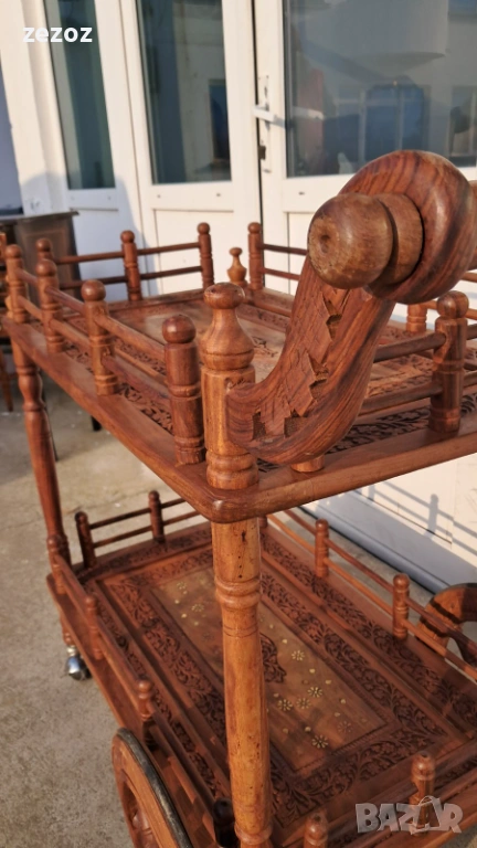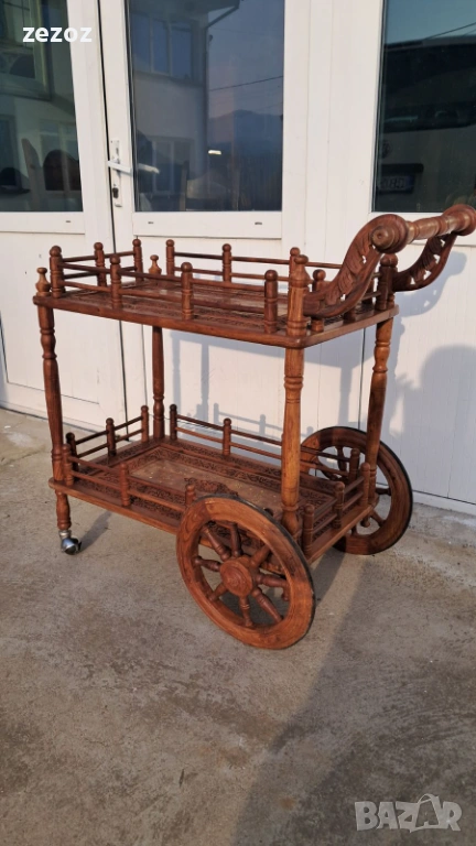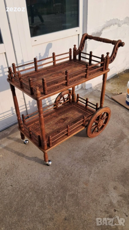 Много красива количка за сервиране,изработена от екзотично дърво.Голяма с големи задни колела покрити с гума.Два плота богато украсени с дърворезба и инкрустация от мед.Конструктивно здрава и запазена.Размери-