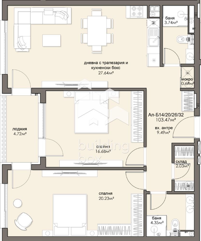 БИЛДИНГ БОКС представя сграда, която се отличава с просторни жилища с перфектно разпределение, нисък процент общи части и високо качество на строителството, изпълнено от опитни професионалисти, които осигуряват сигурност и комфорт за бъдещите обитатели.