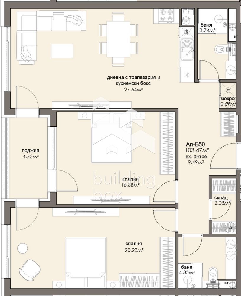 БИЛДИНГ БОКС представя сграда, която се отличава с просторни жилища с перфектно разпределение, нисък процент общи части и високо качество на строителството, изпълнено от опитни професионалисти, които осигуряват сигурност и комфорт за бъдещите обитатели.