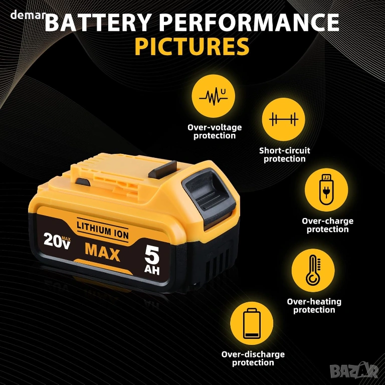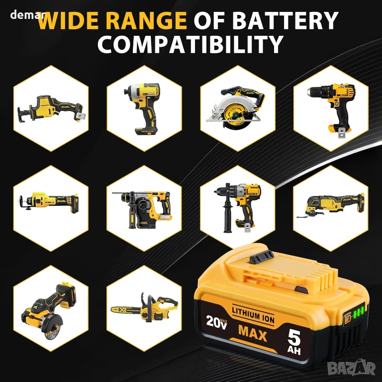 Литиево-йонна батерия с капацитет 5000 mAh, проектирана като заместител на 18V батерии DeWalt, съвместима с различни безжични електрически инструменти и модели като DCB205-2, DCB203, DCB204, DCB206, DCB200 и DCB201. Включва LED индикатор за показване на оставащото ниво на заряд на батерията за по-лесно наблюдение по време на употреба. Вградената интелигентна защита помага за предотвратяване на повреди от презареждане, преразреждане, претоварване и късо съединение, осигурявайки безопасна и надеждна работа.