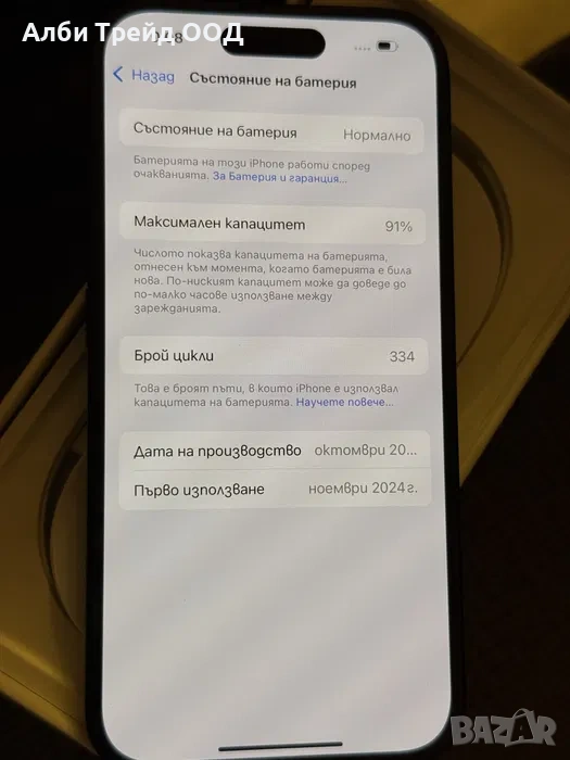 Батерията е оригиналната му, с капацитет 91% в идеално здраве и с издръжливост на високо ниво.