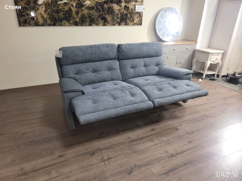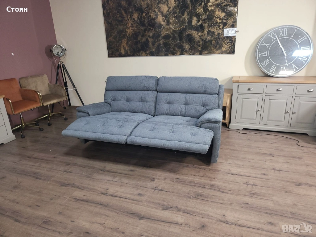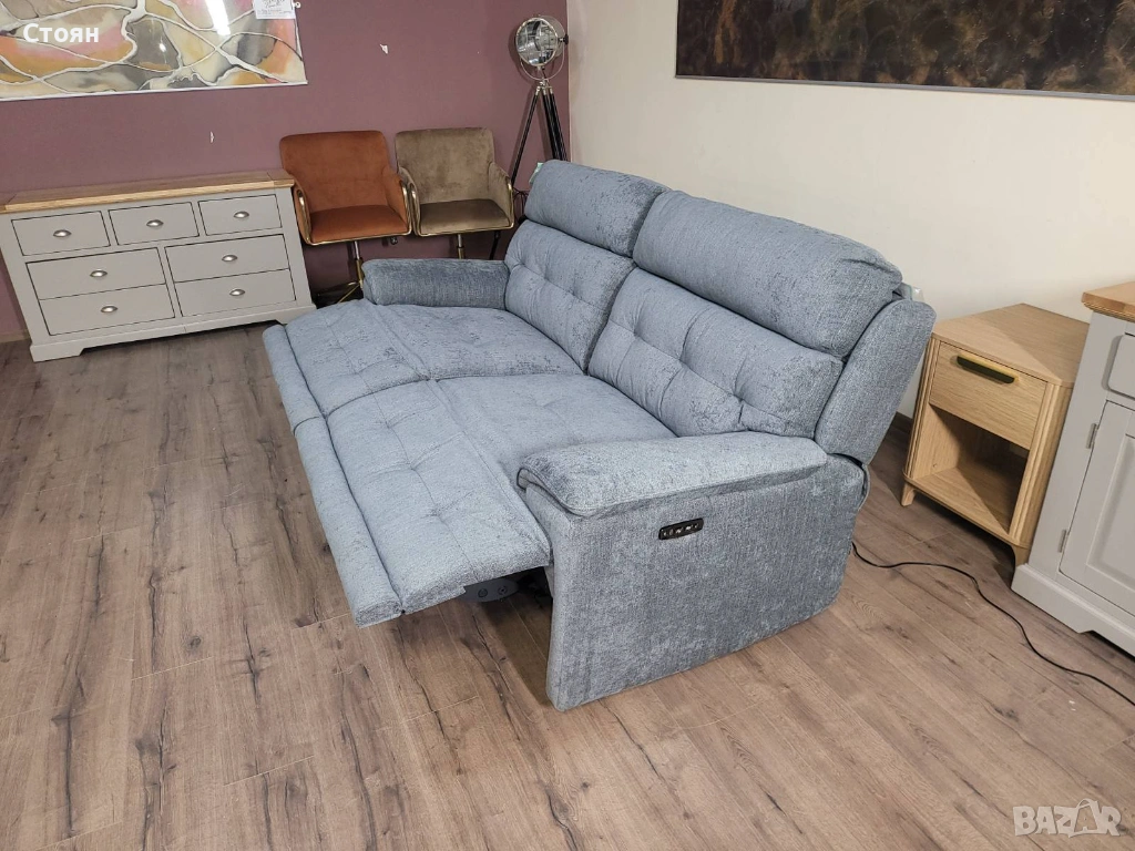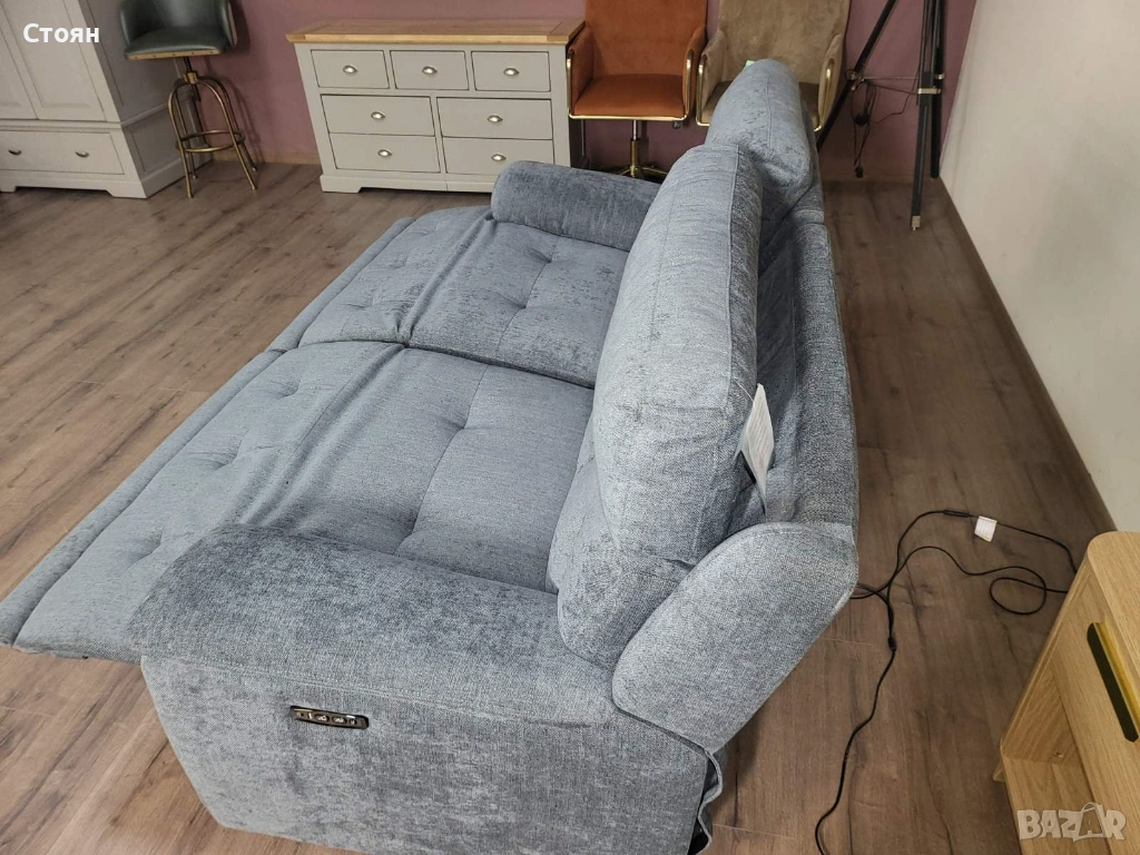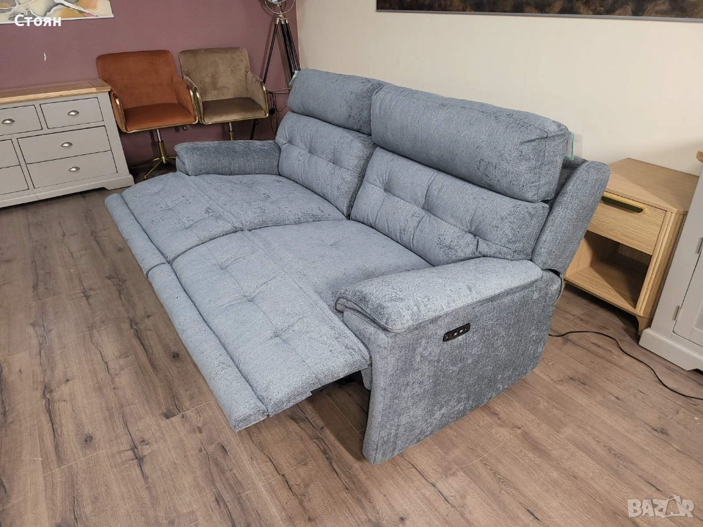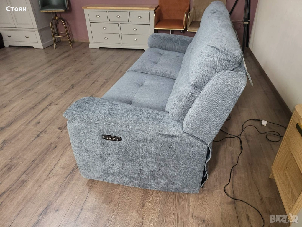 Сив диван тройка от плат с електрически релаксиращ механизъм → Обява 53719996