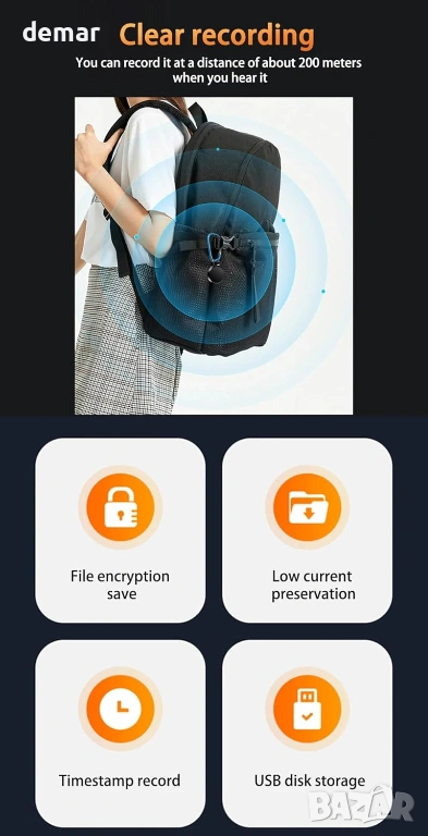 Компактен многофункционален мини рекордер, проектиран като висулка или ключодържател, подходящ за закрепване към чанта, раница или ключове. Изработен с издръжлив водоустойчив и прахоустойчив корпус за ежедневна преносимост. Разполага с безшумен запис с едно щракване, позволяващ мигновен запис без светлини или звук, плюс интелигентен гласово активиран запис, който автоматично спира по време на тишина, за да пести памет и батерия. Оборудван с двуядрена технология за намаляване на шума, която минимизира фоновия шум и възстановява чист човешки глас дори в натоварена среда. Поддържа директно възпроизвеждане от слушалки и основни контроли на файловете, като възпроизвеждане, пауза, пропускане и изтриване. Също така позволява прехвърляне и възпроизвеждане на файлове чрез OTG връзка с телефони с Android. Подходящ за срещи, интервюта, лекции и водене на бележки.