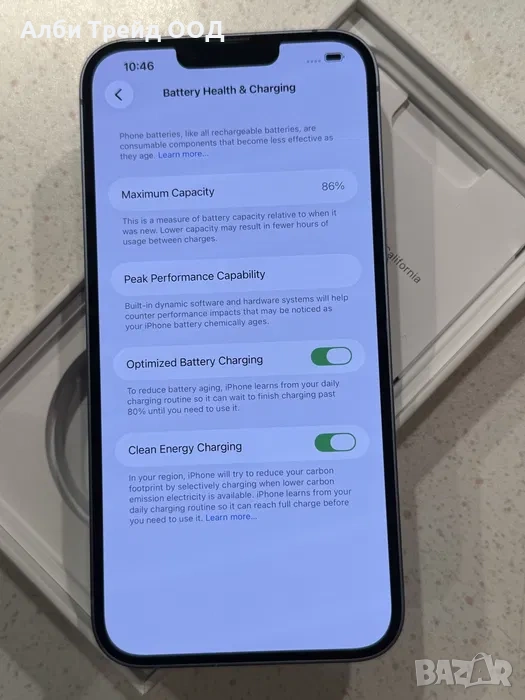 Батерията е оригинална с капацитет 86% в идеално здраве и с издръжливост на високо ниво.