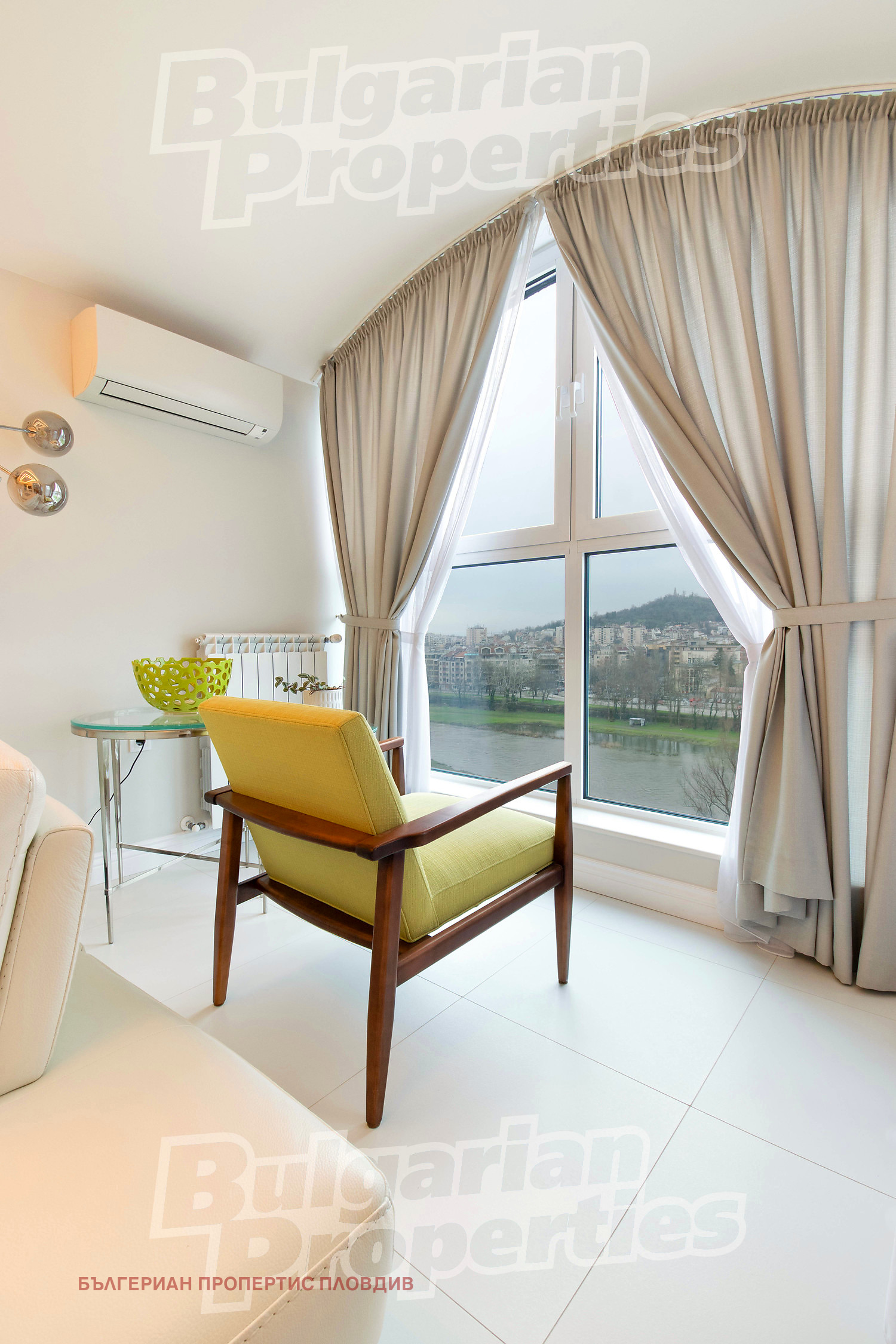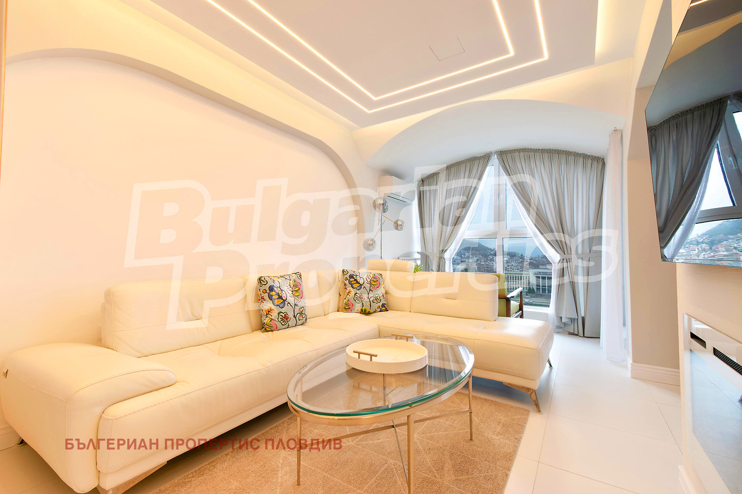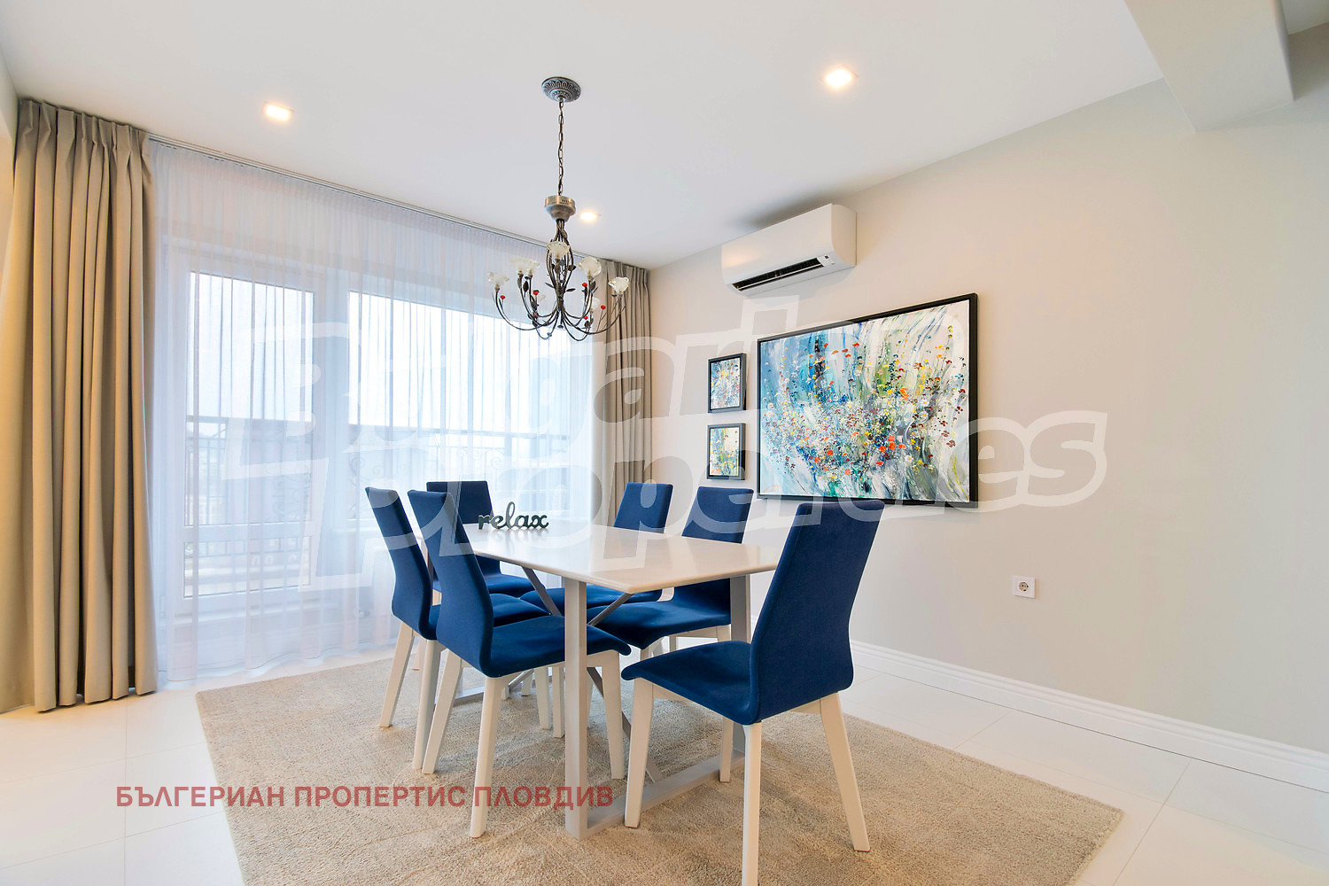Апартаментът е напълно завършен и готов за нанасяне без необходимост от допълнителни инвестиции. Още при влизане впечатлява просторната дневна зона, решена в светла гама с дизайнерски окачен таван и вградени LED линии, които подчертават модерната архитектура. Големите френски прозорци разкриват панорамна гледка към реката и града, като изпълват пространството с естествена светлина през целия ден. Всекидневната е обзаведена с висок клас кожен ъглов диван, стъклена холна маса и изчистени мебели. Обособен е уютен кът до прозореца идеално място за сутрешно кафе с гледка към Марица. Кухнята е в американски стил, с остров и бар столове, изпълнена с висок клас вградени електроуреди, дизайнерски шкафове и скрито LED осветление. Пространството е изключително функционално и елегантно, с изчистени линии и модерна визия. Трапезарията разполага с голяма маса и стилни столове подходяща както за семейни вечери, така и за представително посрещане на гости. Спалните са решени в спокойни, елегантни тонове, с големи легла. Подовите настилки от естествен паркет създават усещане за топлина и качество.