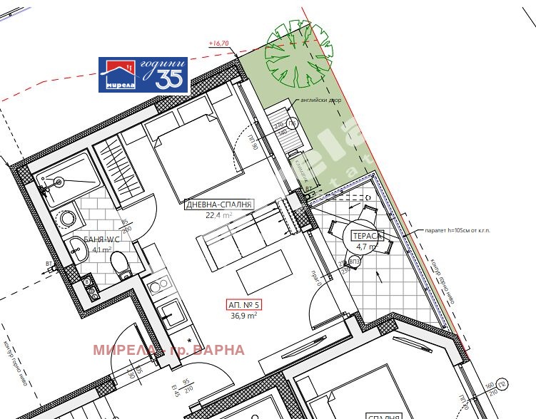 РАЗПРЕДЕЛЕНИЕ: дневна с трапезария/ спалня 22.40 м2, баня с тоалетна 4.10 м2 и тераса 4.70 м2. Към апартамента има прилежащ английски двор.