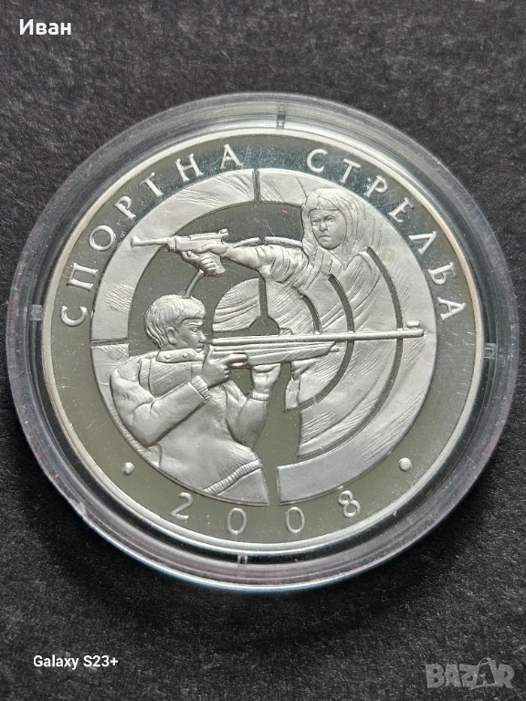 Продавам сребърна монета 10 лева от 2008 година,Спортна стрелба,23.33 грама с чистота 925/1000 и тираж 5000 броя.