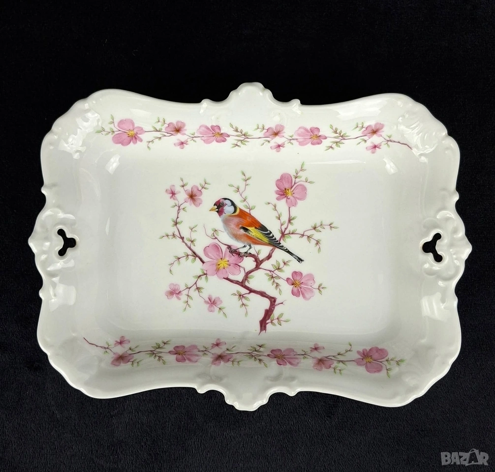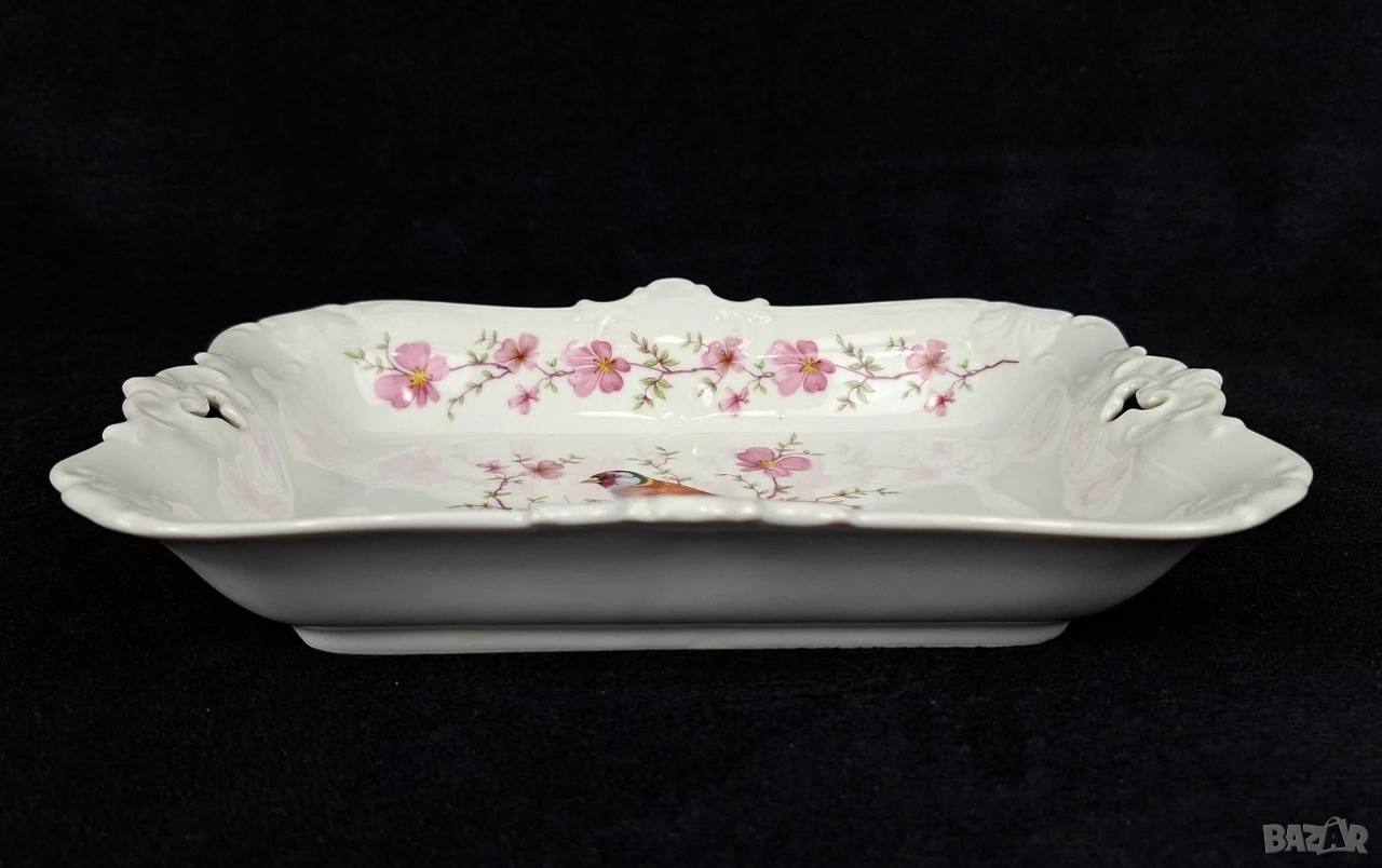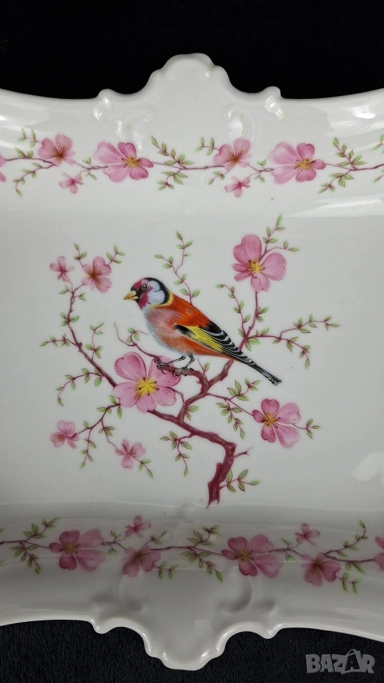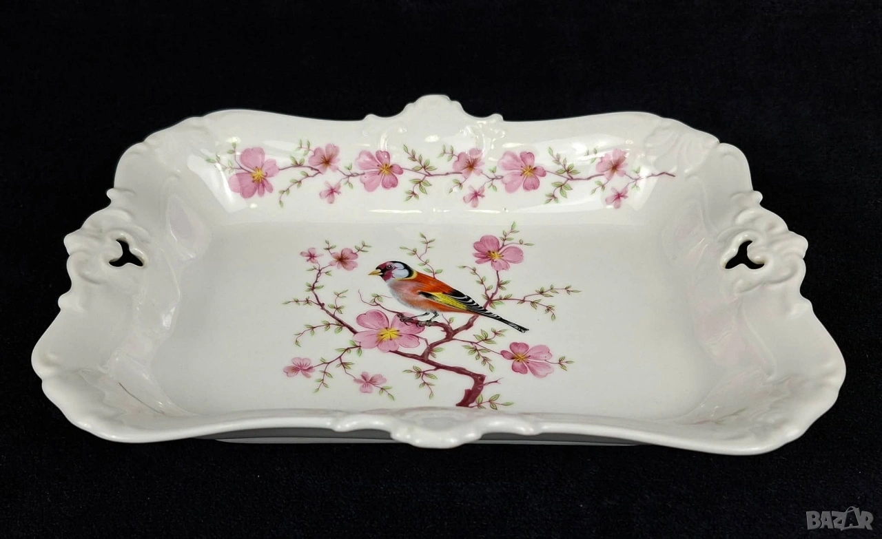 Елегантно порцеланово плато с релефен борд, декорирано с нежна композиция от розови цветове и пъстро птиче, кацнало на клонка. Изключително фин детайл и свежи цветове, които придават романтично излъчване.