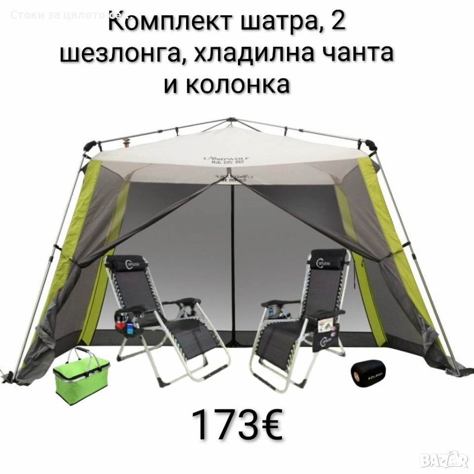 Къмпинг комплект: шатра, 2 шезлонга, хладилна чанта и колонка