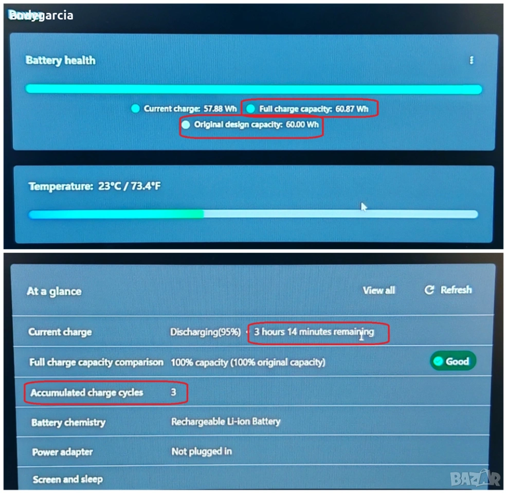 - батерия на 3 цикъла /НА СНИМКИТЕ/ с реален капацитет от 60.87Wh, което дори е малко повече фабричните 60Wh /стандартно от Леново слагат малко буфер/, живот до 3:00-4:00 часа и повече, в зависимост от натоварването.