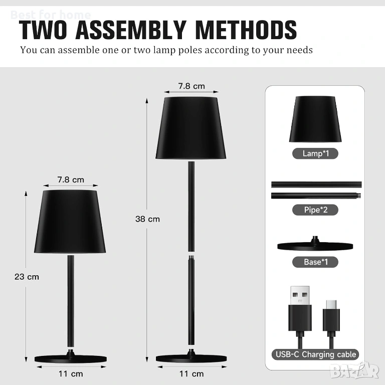 【Нощна лампа с 2 височини】 Височината на безжичната настолна лампа е регулируема, а стойката е разделена на две части. Можете да изберете желаната височина и да ги сглобите, за да паснат на различни сцени. Висока: 38 см, Ниска: 23 см. Отговаря на различните ви сценарии на употреба и създава различна атмосфера.