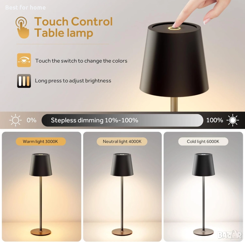 【Безжична настолна лампа с 3 цвята и димиране】Непрекъснато димиране и 3 цветови режима: Цветна температура: 3000K топла бяла светлина, 4000K топла светлина, 6000K бяла светлина; Безстепенна регулируема яркост от 10% до 100%, можете лесно да променяте яркостта чрез продължително натискане на сензорния бутон за управление в горната част на лампата, създавайки топла и романтична атмосфера.