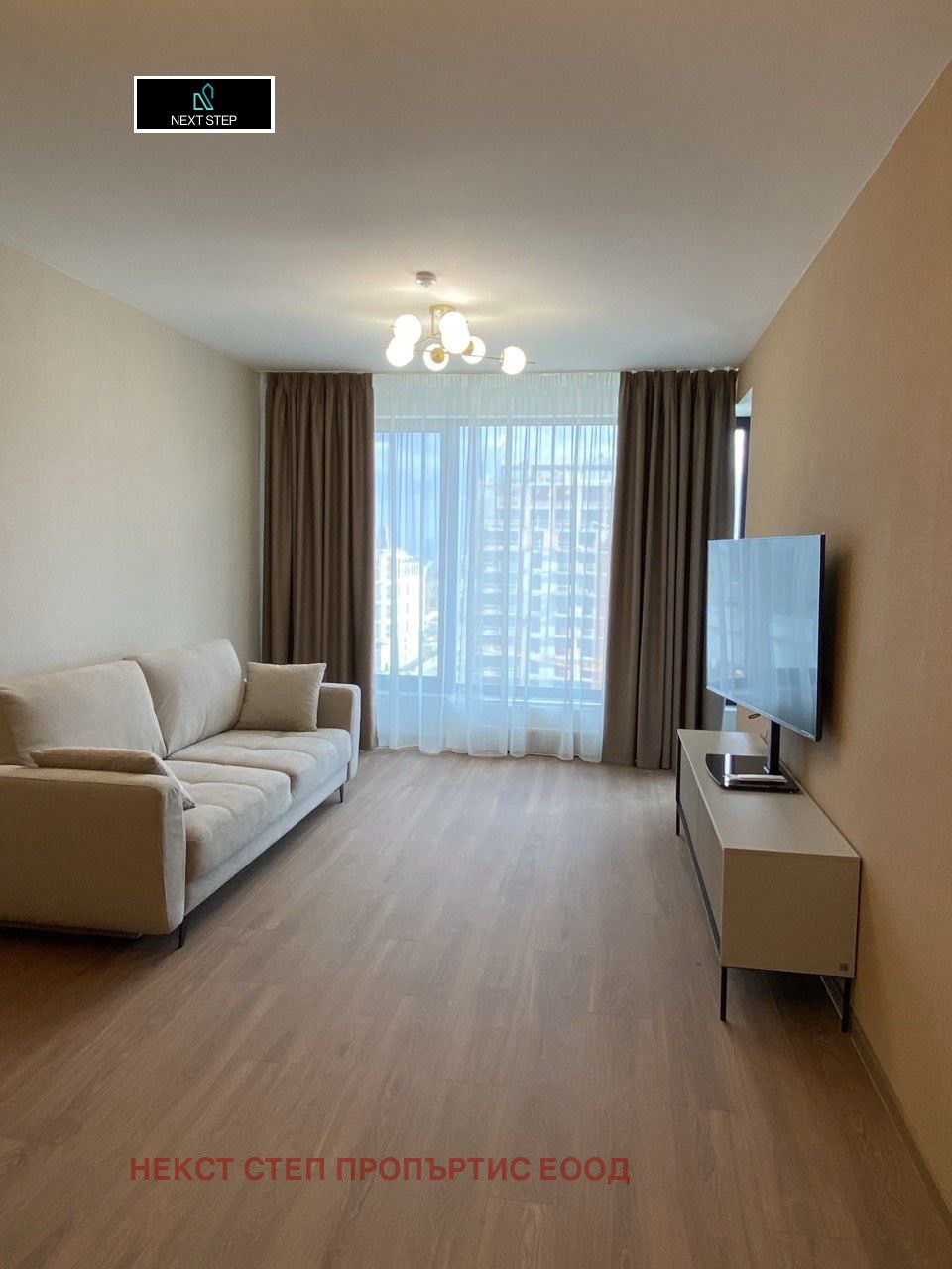 Апартаментът включва просторна дневна зона с панорамни прозорци, модерна кухня с вградени уреди, стилна спалня с вграден гардероб, луксозна баня и балкон с гледка към София.
