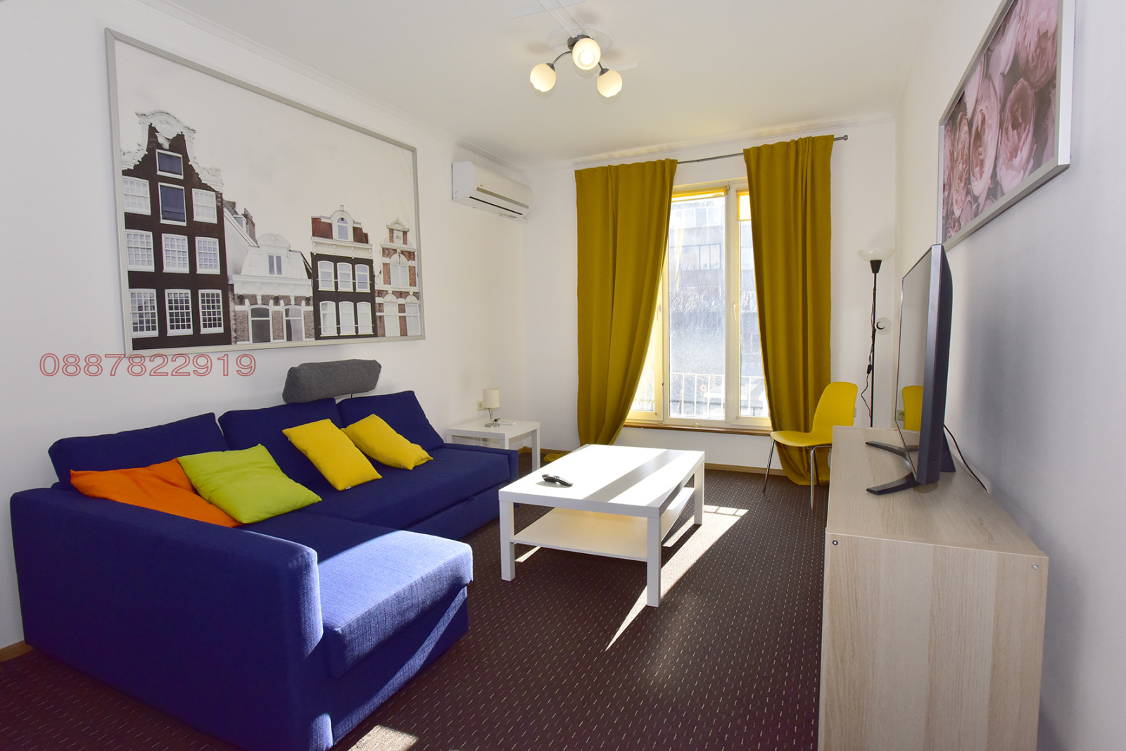 Owner offers a luxurious fully furnished apartment in the heard of Sofia in the area of Vitosha Blvd. The apartment is bright, quiet and warm with an area of 80 m2. It has a large living room with a dining area, a large bedroom with a balcony, a kitchen with a balcony, a spacious bathroom-toilet, a spacious entrance hall. The bedroom and the living room are facing south-southeast, overlooking a beautiful green courtyard.