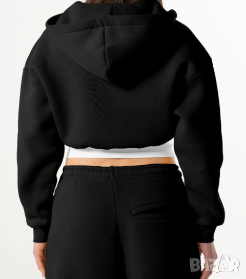 Стилен дамски кроп суичър (Zip Crop) в черен цвят с деликатна бродерия 'Flaw'. Модерен дизайн с цял цип и качулка, идеален за висока талия дънки или клин. Изработен от мека и комфортна материя.