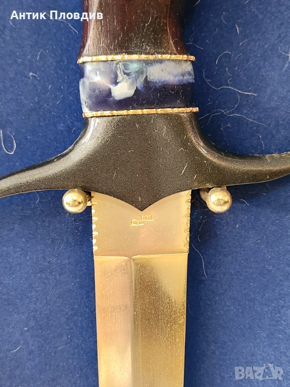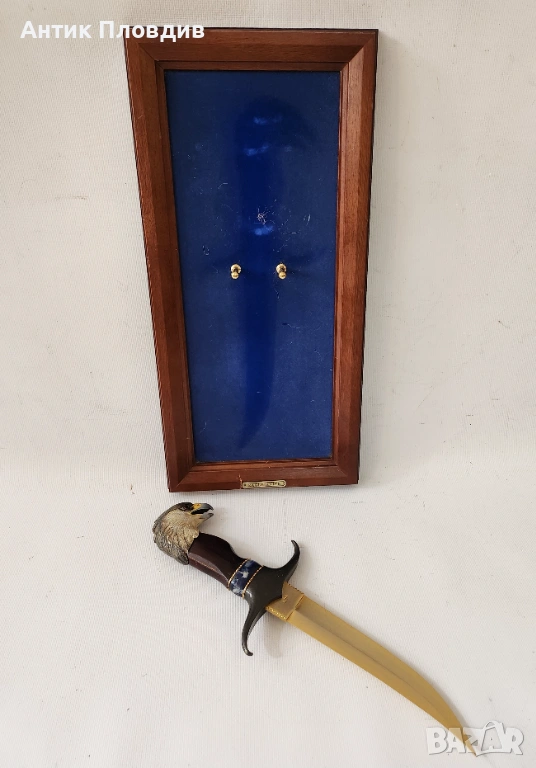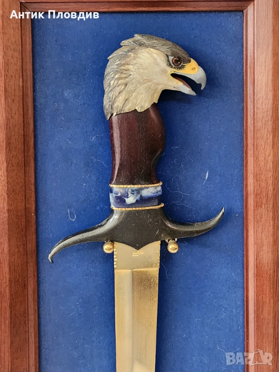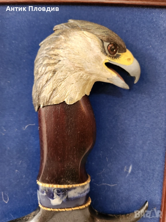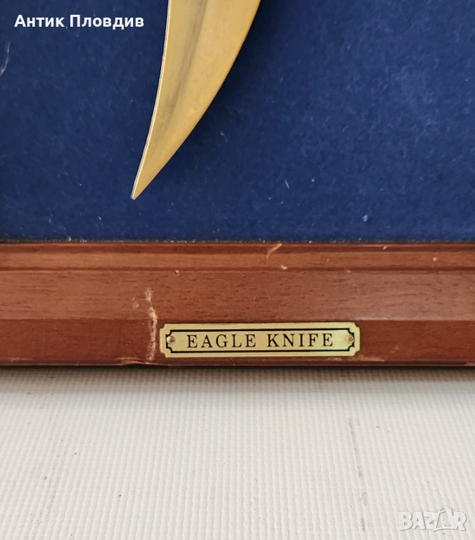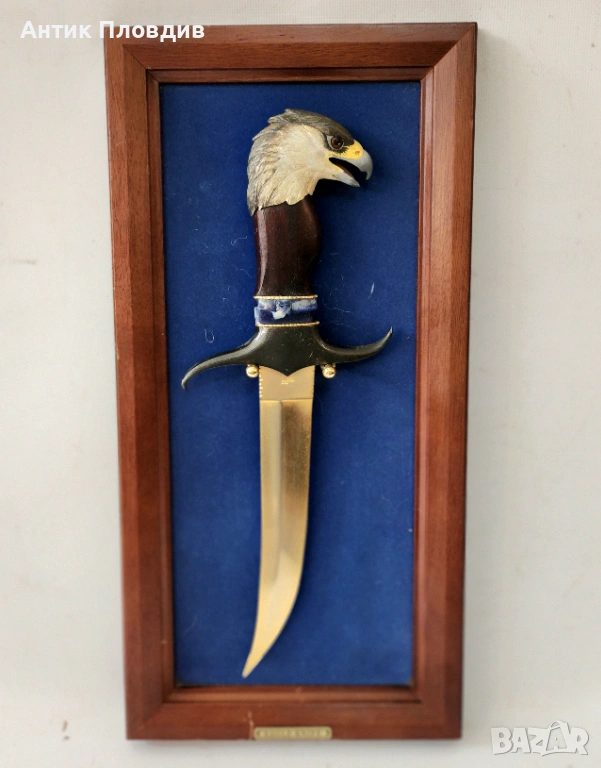 Декоративен нож със скулптурна дръжка във формата на глава на орел, монтиран в дървена рамка със син фон и табелка “Eagle Knife”. Острието е в класическия стил Bowie – с извита линия и изразителен връх, характерен за американските ловни ножове.