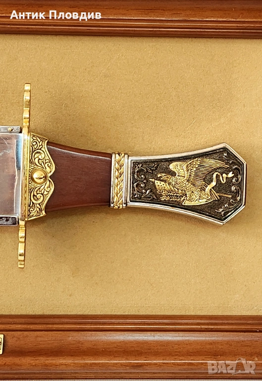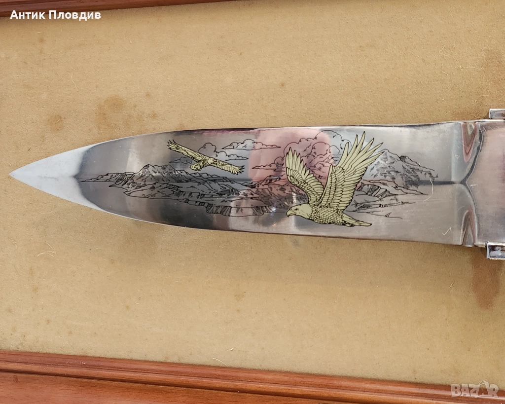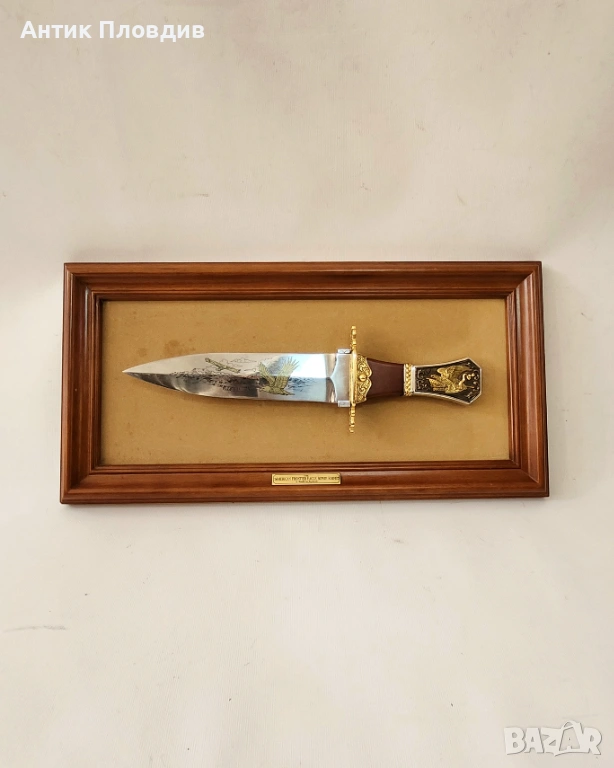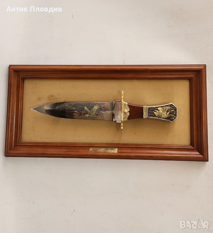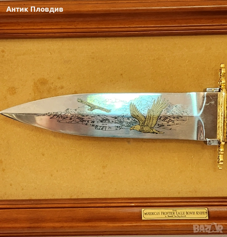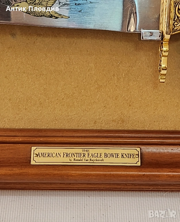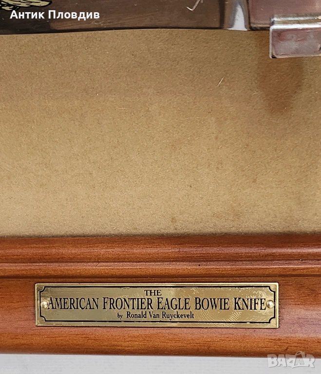 Колекционерски декоративен нож “The American Frontier Eagle Bowie Knife”, произведен от The Franklin Mint (САЩ) по дизайн на Ronald Van Ruyckevelt. Острието е украсено с гравирана сцена с орел и е изпълнено в класическия стил Bowie, характерен за американската Frontier епоха.