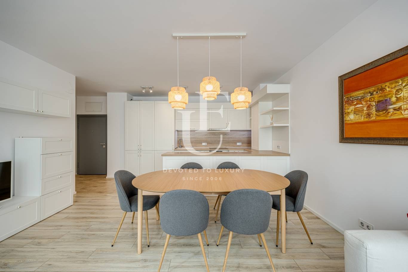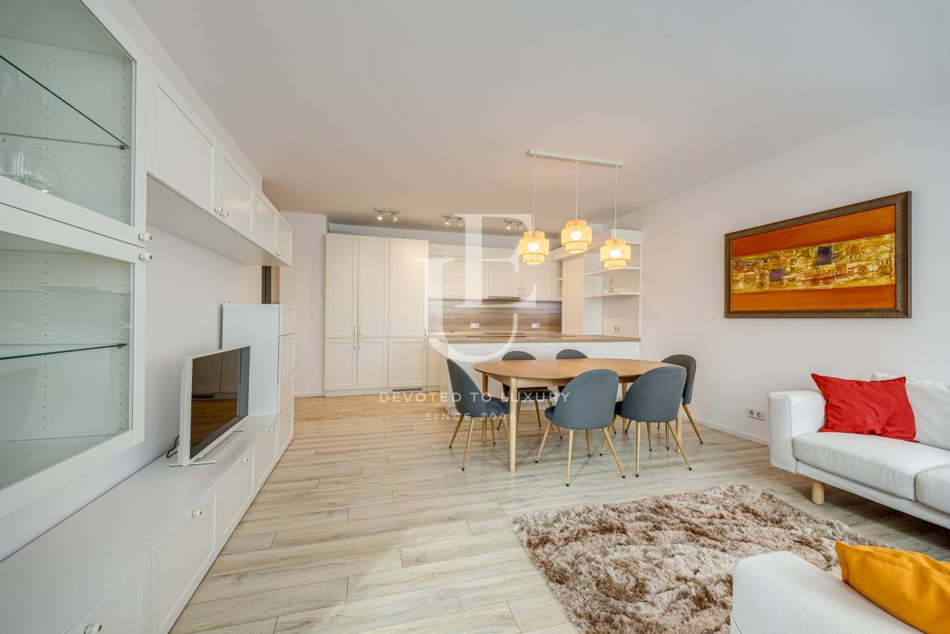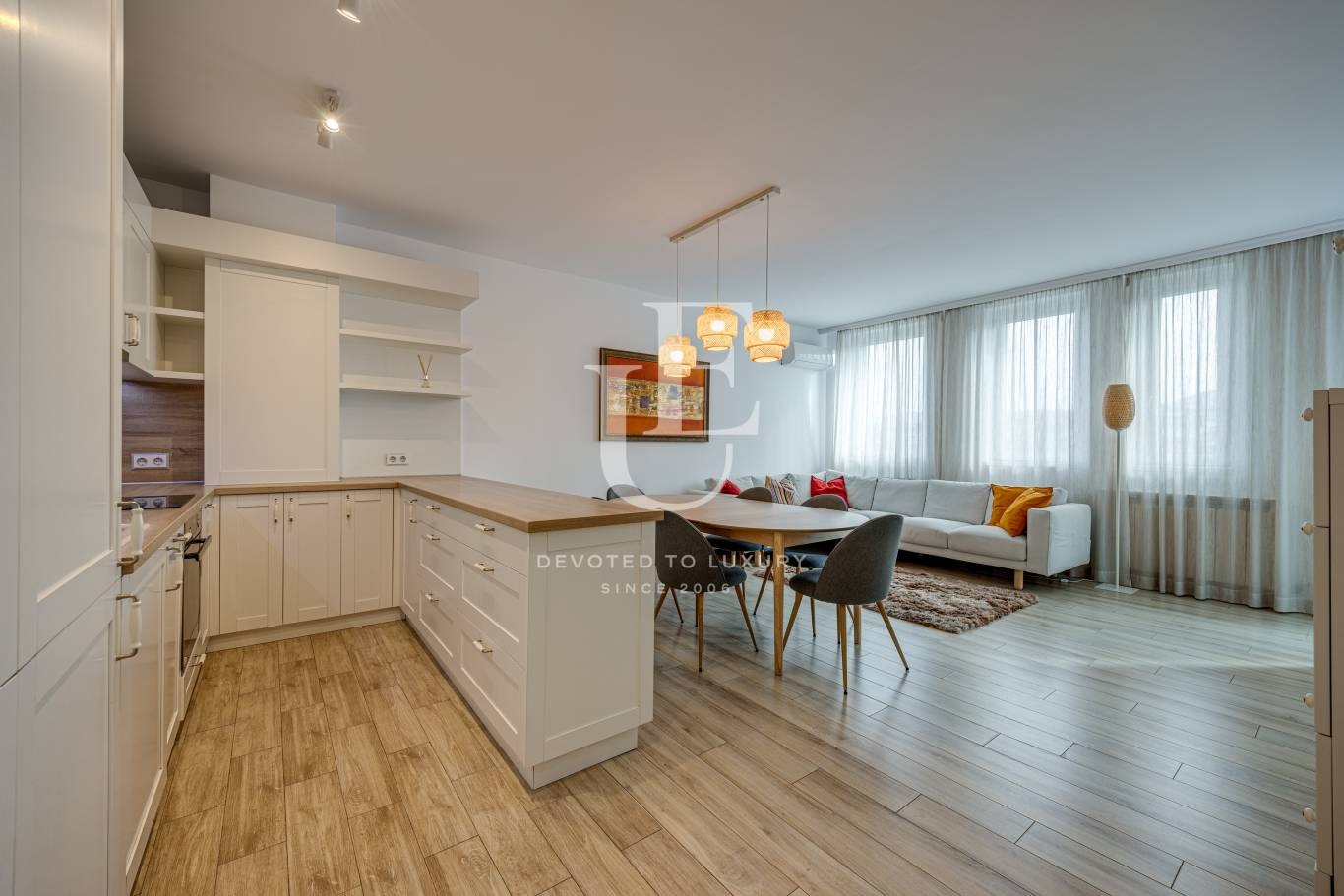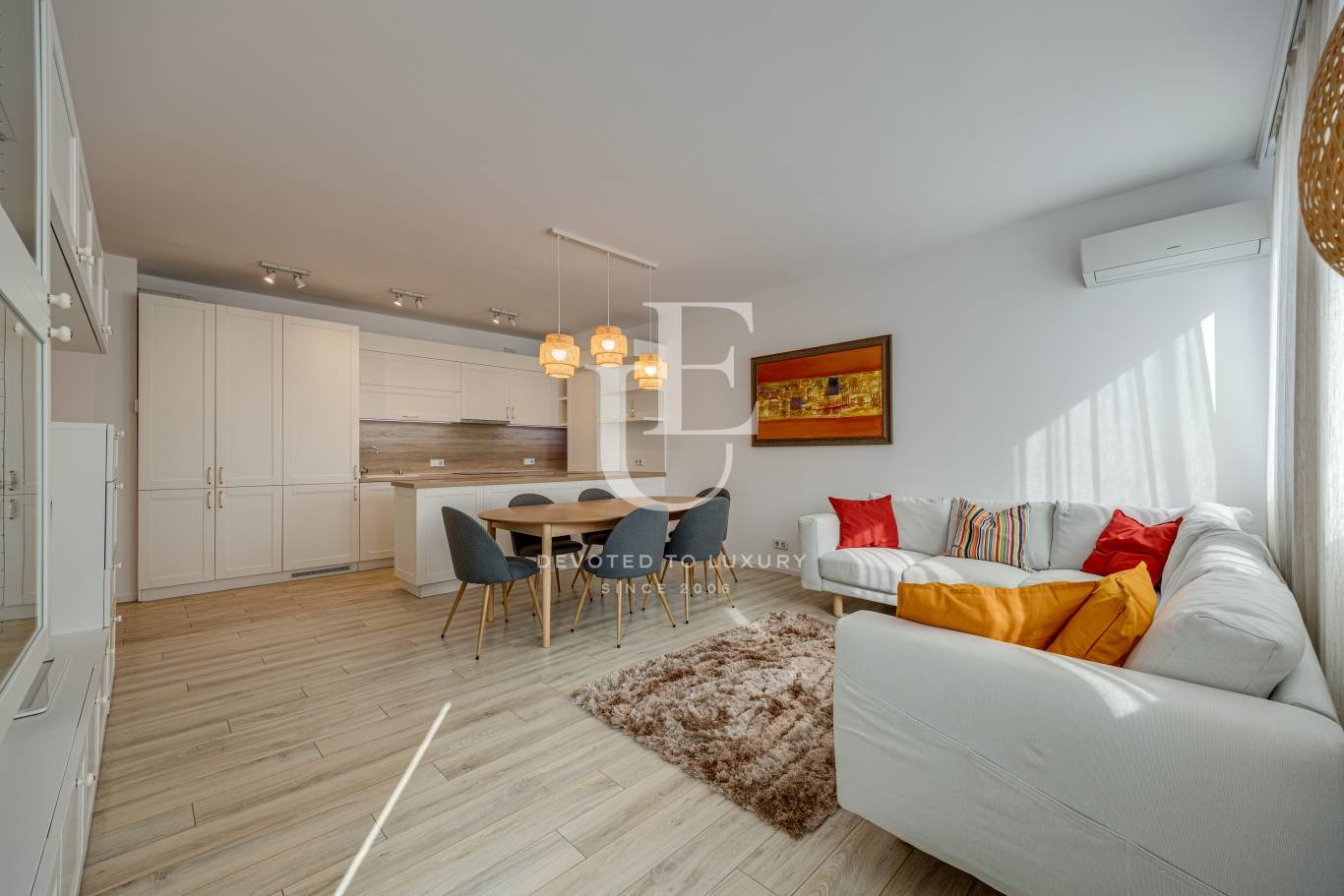 Просторната дневна с кухненски бокс е обзаведена с удобен Г-образен диван и трапезария с капацитет за шест души. Кухненският бокс е напълно оборудван с вградени уреди, включително четири котлона, миялна машина, хладилник и фурна, както и изобилие от пространство за съхранение. Дневната е с излаз към балкон с панорамна гледка към Витоша - идеалното място за релакс.