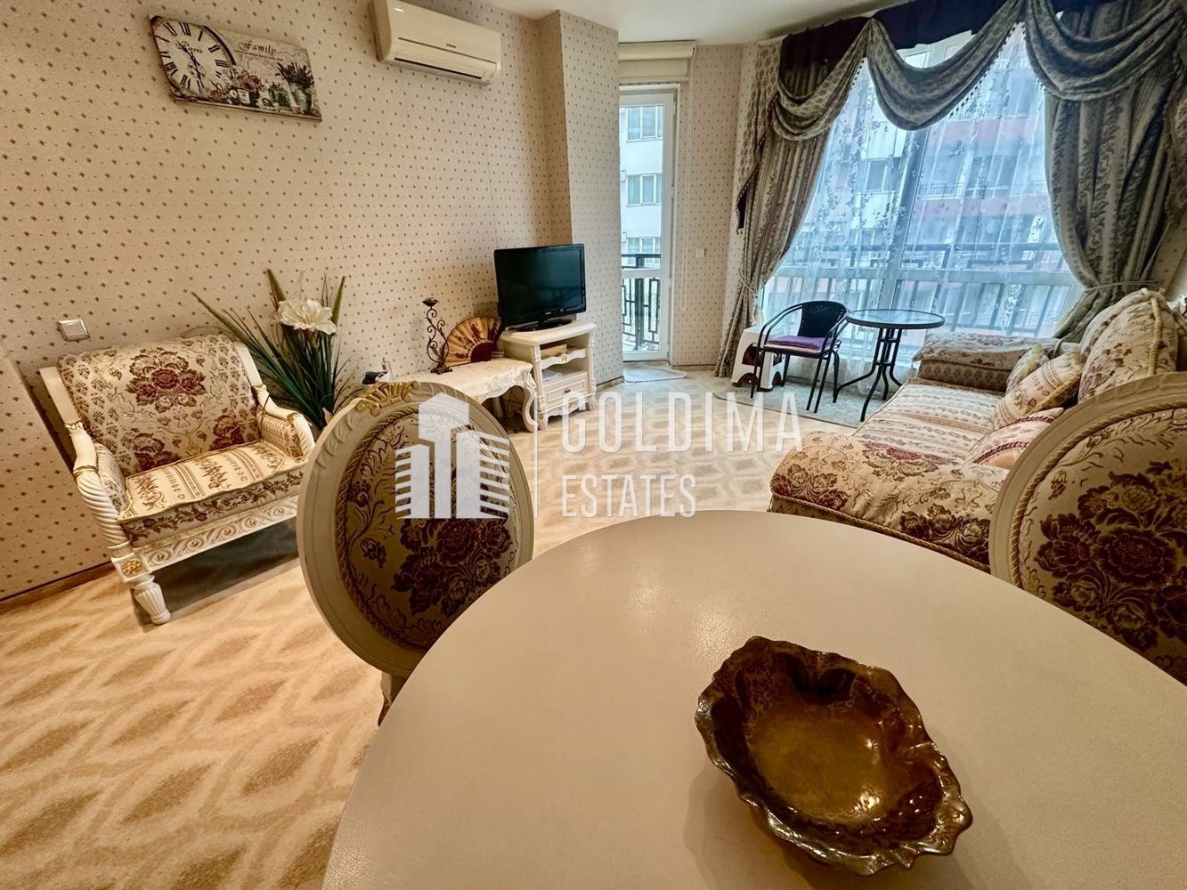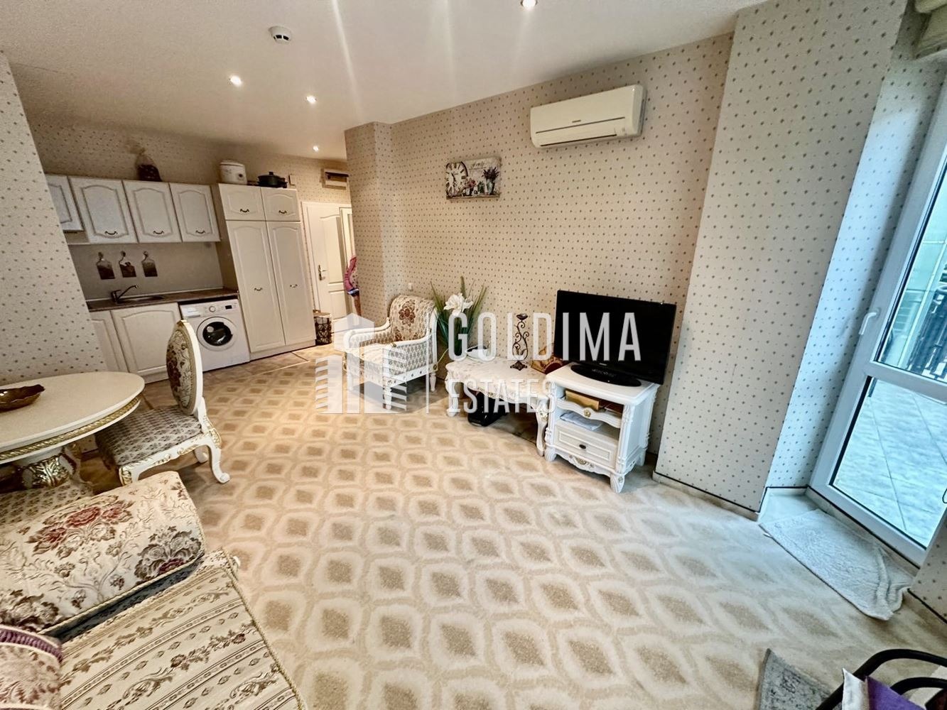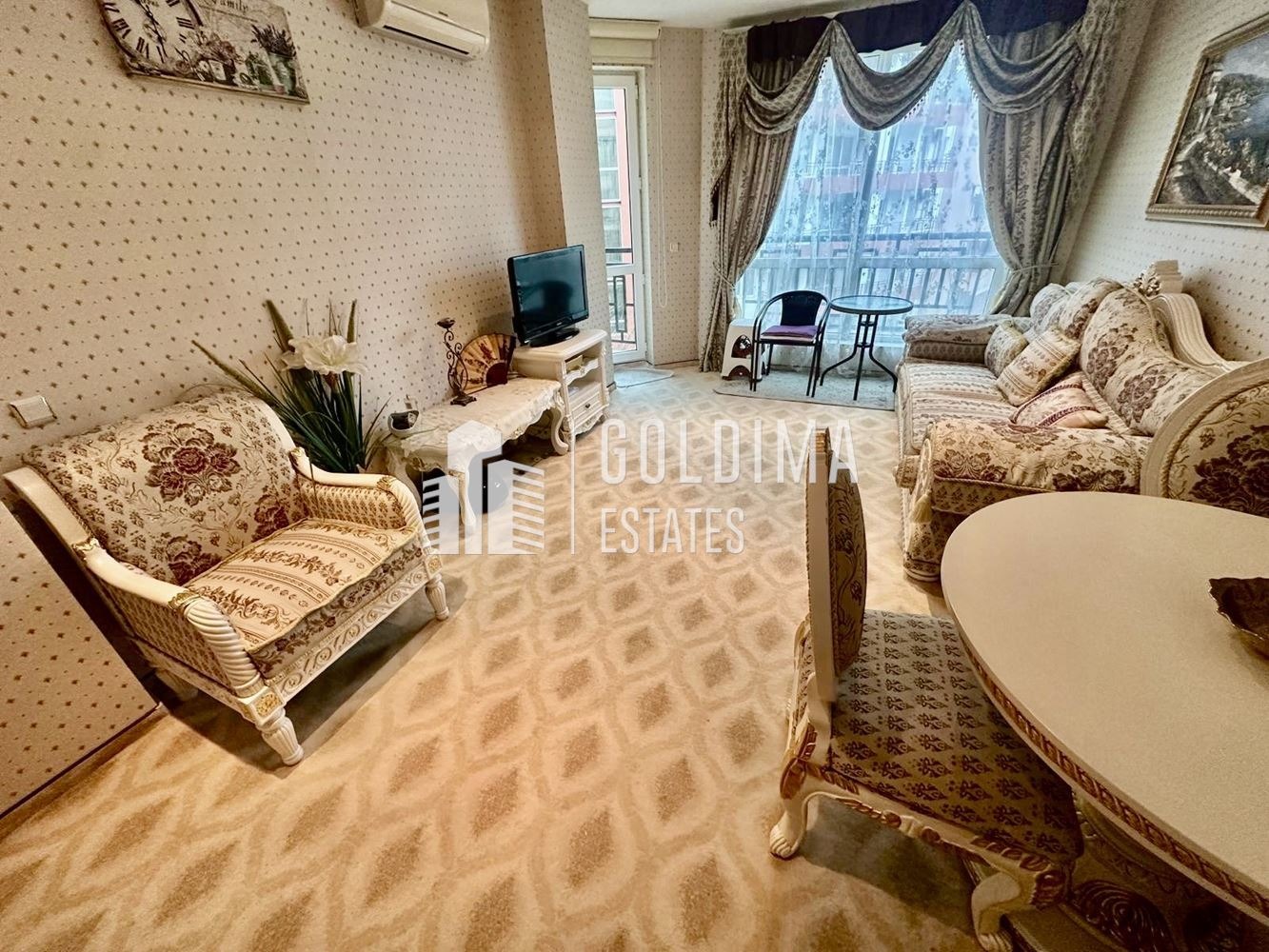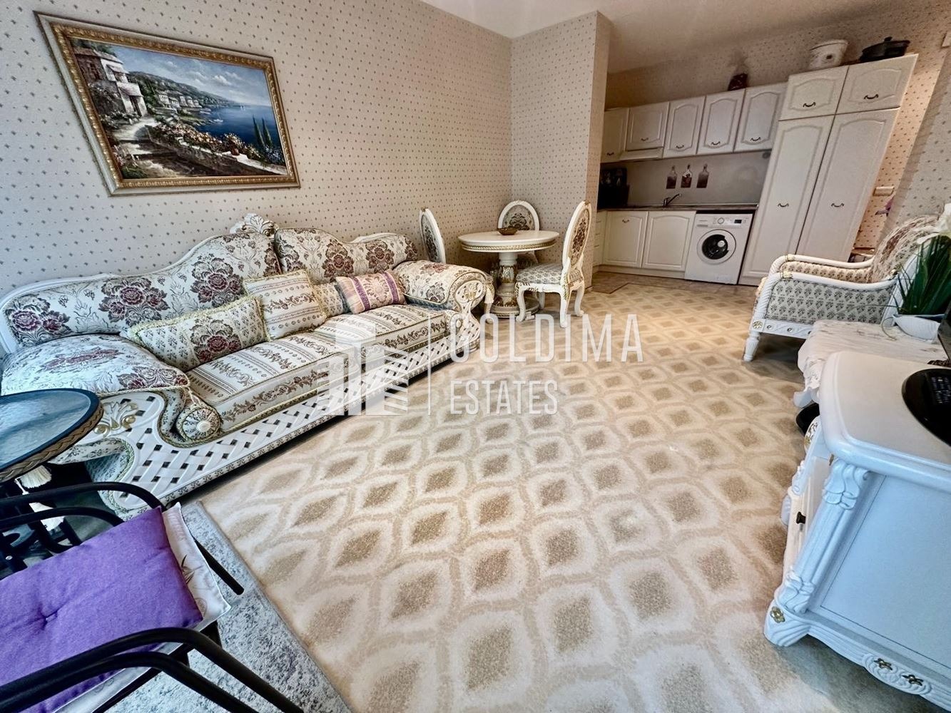 ГОЛДИМА Естейтс продава обзаведен двустаен апартамент в к.к. Елените, до плажа, с гледка море. Състои се от просторна дневна с кухненски кът, спалня, санитарен възел, входно антре, обща тераса за двете стаи. Напълно обзаведен и оборудван с всички необходими за бита ел. уреди. Готов за нанасяне веднага!