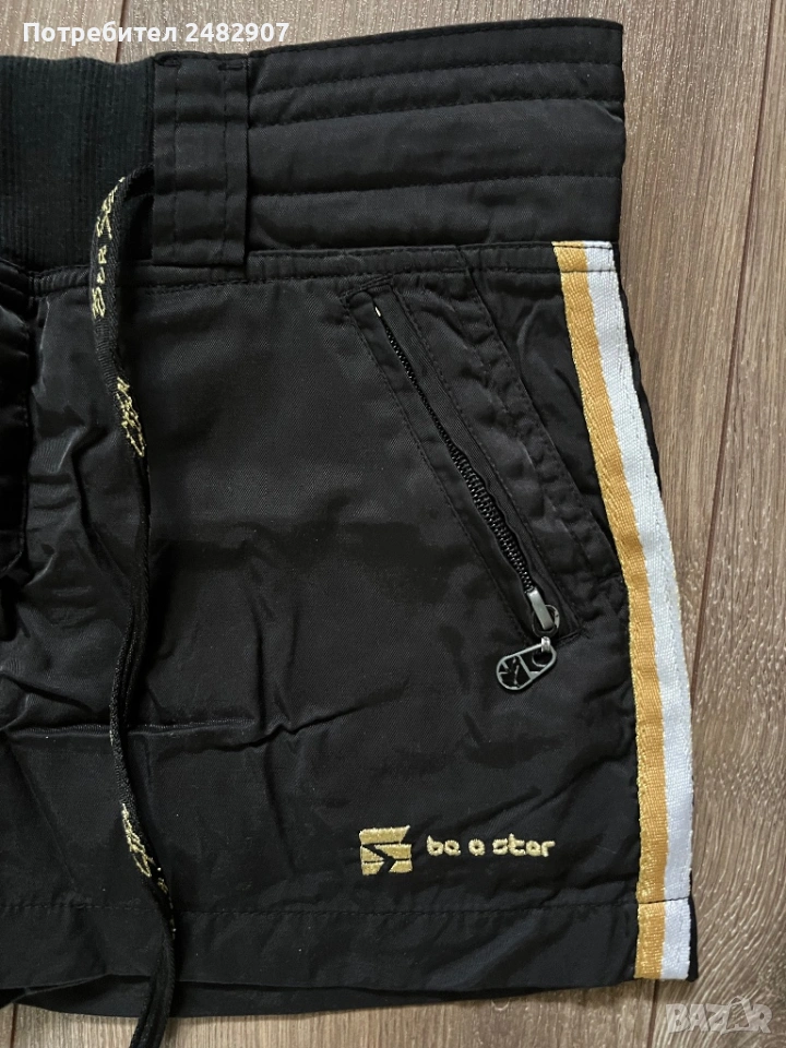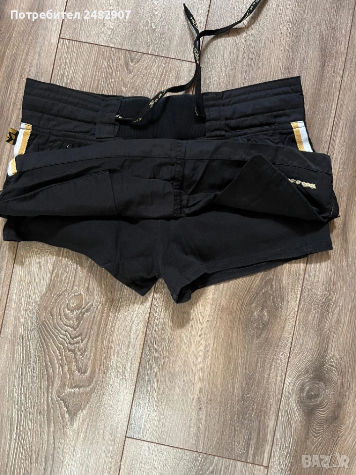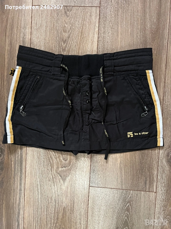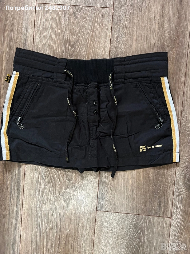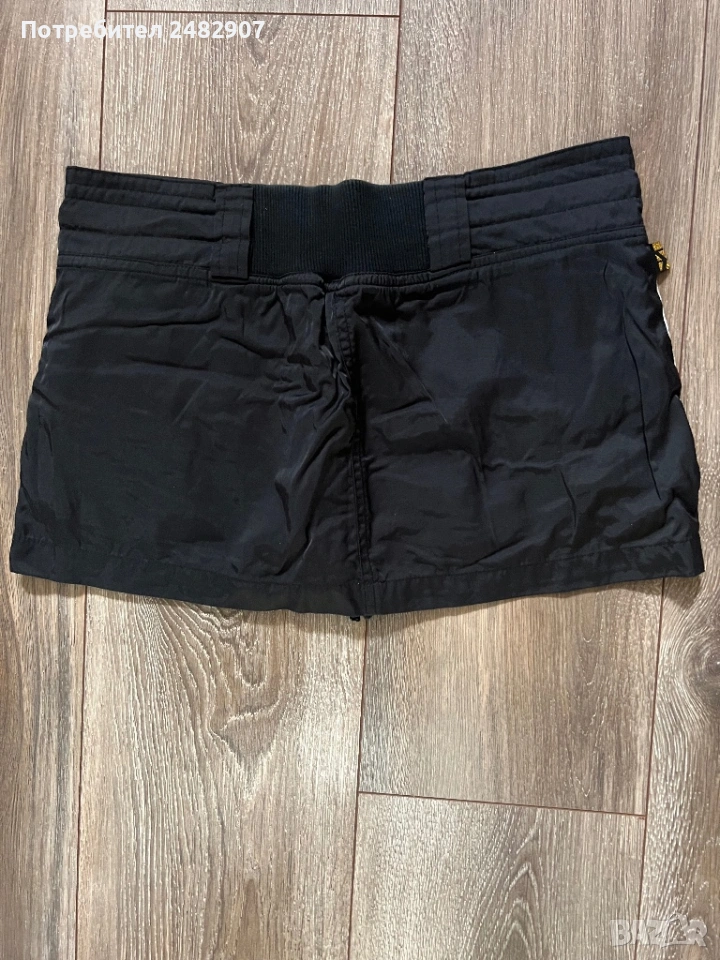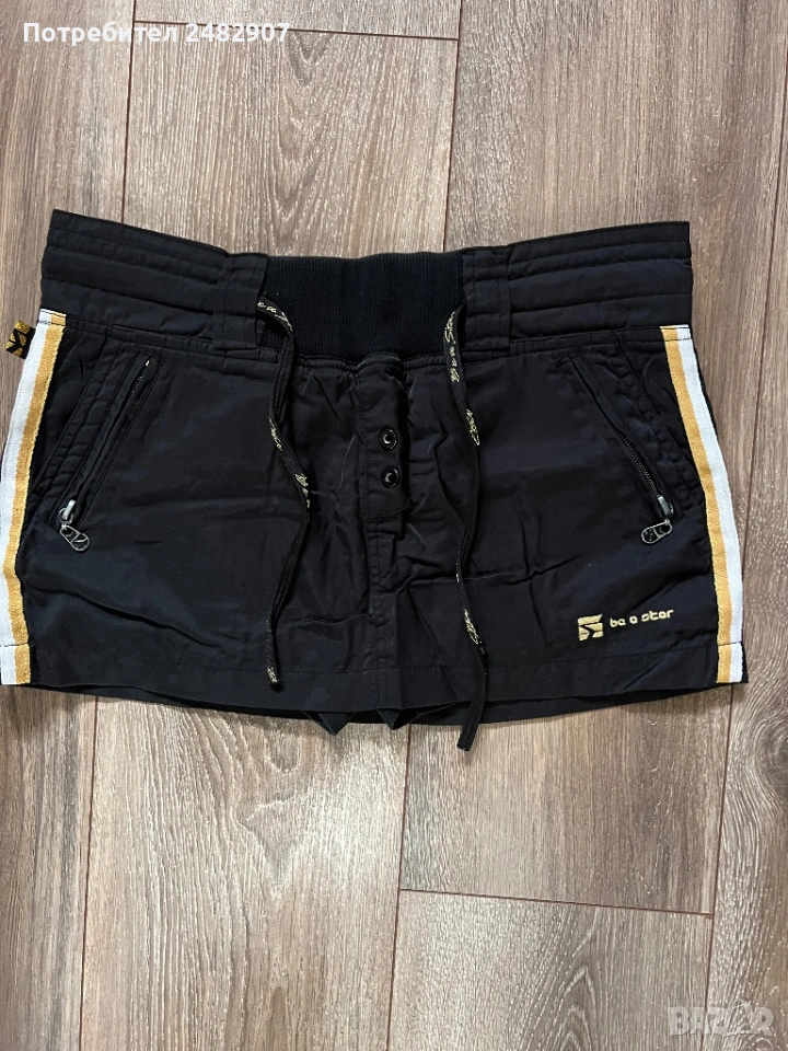 Черна дамска мини пола с къс панталон отдолу, размер М. Ширина в талията - 38 см, ширина в долната част - 47 см, дължина от талията до долу - 27 см. Много запазена, почти не е използвана, с двойни джобове отпред и връзки в талията. Полата не е еластична, панталонът отдолу е еластичен, от трико и прилепва по тялото.