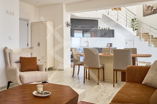 РАЗПРЕДЕЛЕНИЕ: Предлагаме апартамент тип мезонет в площ от 390 кв.м., функцонално разпределени в два етажа. Първи етаж просторна всекидневна с кухненски бокс, спалня, баня с тоалетна и тераса. Втори етаж две спални, баня с тоалетна, гардеробна и тераса.