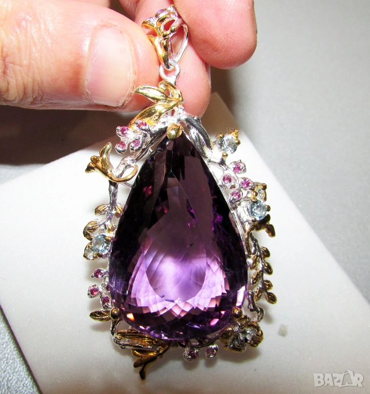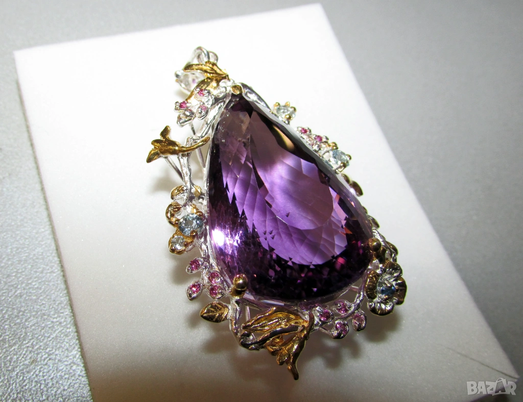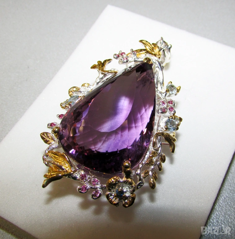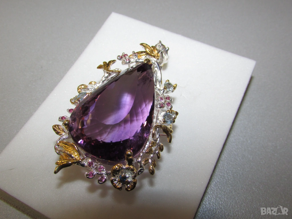 Аметист 65x34x21, 80 карата, тегло 29.9 гр. Другите камъни са топаз, сапфир и гранат роодолит - 170 евро.