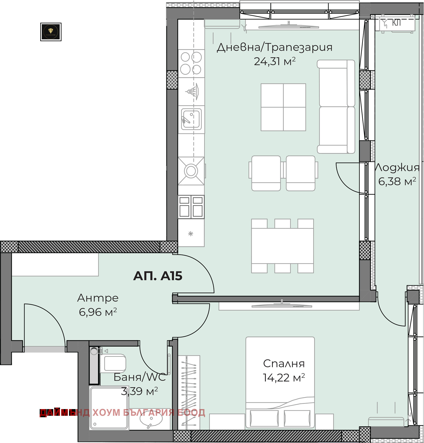 📐разпределение: Дневна с трапезария, спалня, баня и wc, антре и тераса.