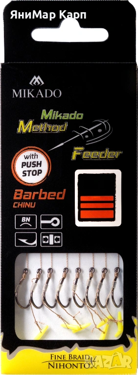 Продавам готови монтажи Mikado Method Feeder с Push Stop и Chinu куки – професионални поводи за method feeder риболов, изработени от плетена линия Nihonto Fine Braid 0.12мм в камо кафяво.