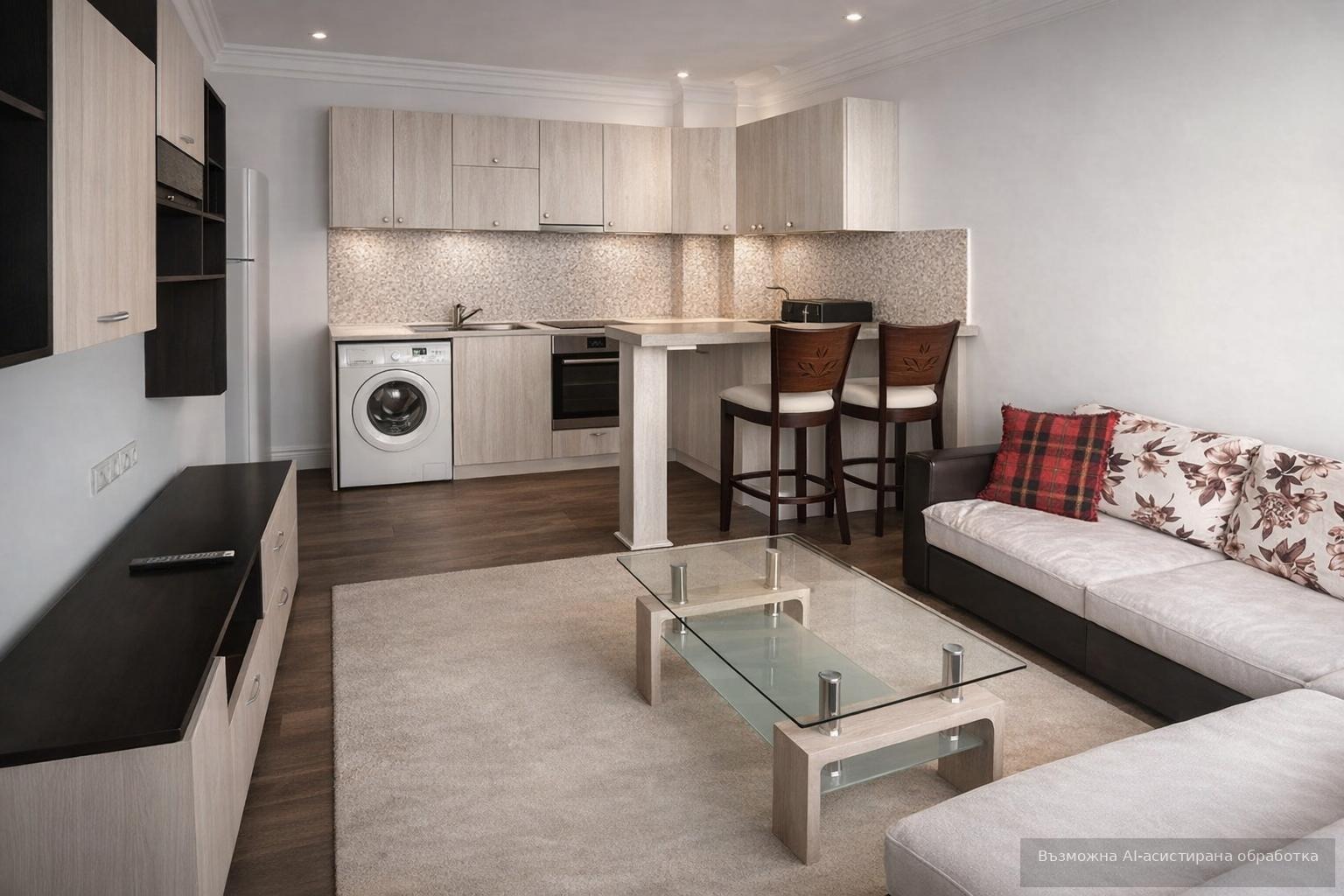 Жилището се предлага напълно обзаведено и оборудвано с всичко необходимо за едно домакинство. Към него има складово помещение. Паркирането в района е свободно.