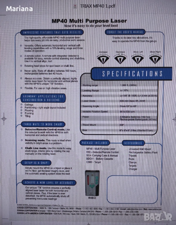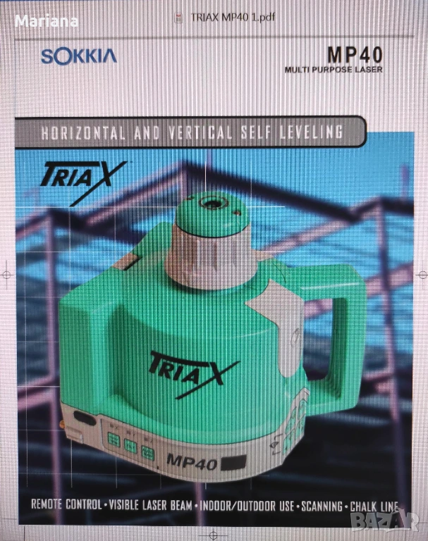 Много запазен Професионален Ротационен Лазерен Нивелир TRIAX MP40 на Японската фирма Sokkia. Прецизно самонивелиране със сервомотори, променлива скорост на въртене, възможност за сканиране, удобна и лесна експлоатация. Приемникът TRG-R80 е работещ и служи като дистанционно и датчик за точно позициониране на дълги разстояния.
