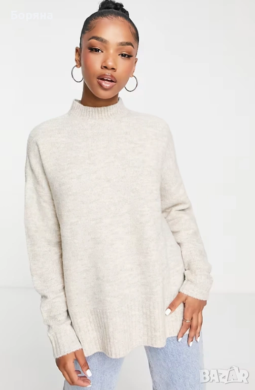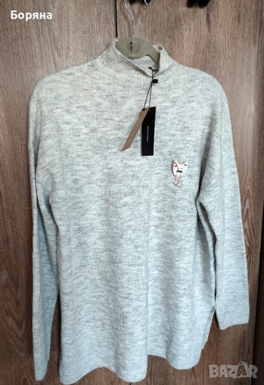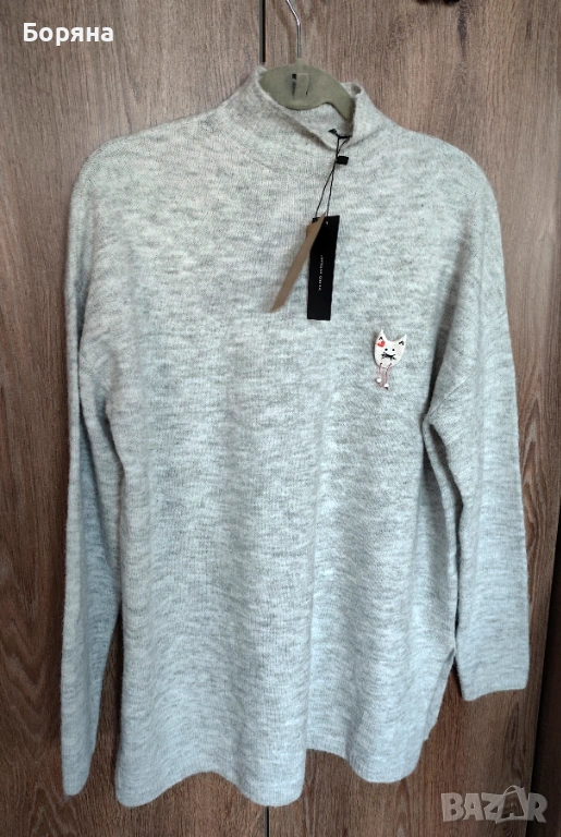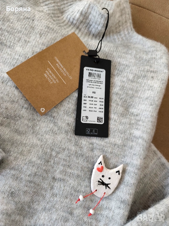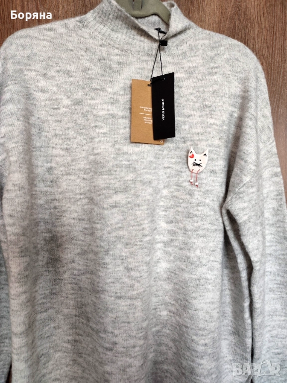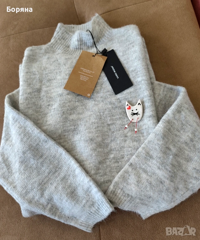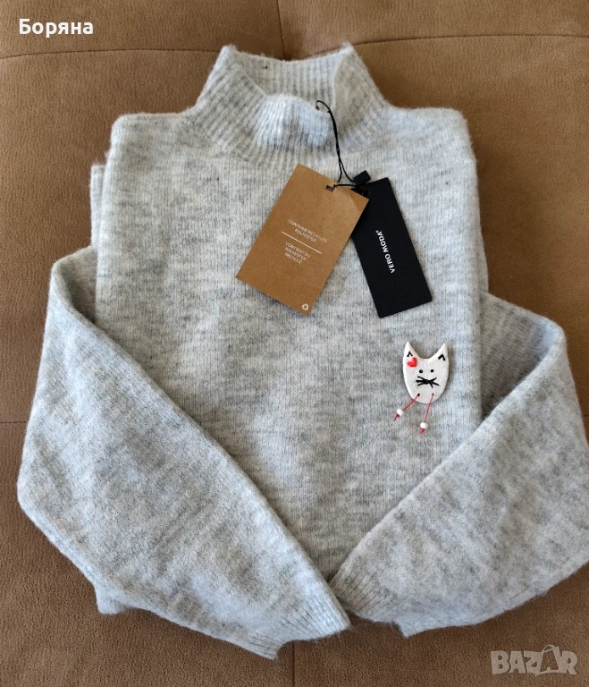 Vero Moda ново с етикет поло тип пуловер, размер XS, но е oversize и е подходящ до L, цвят сив меланж, декорирано с красива брошка, изработена от глина.